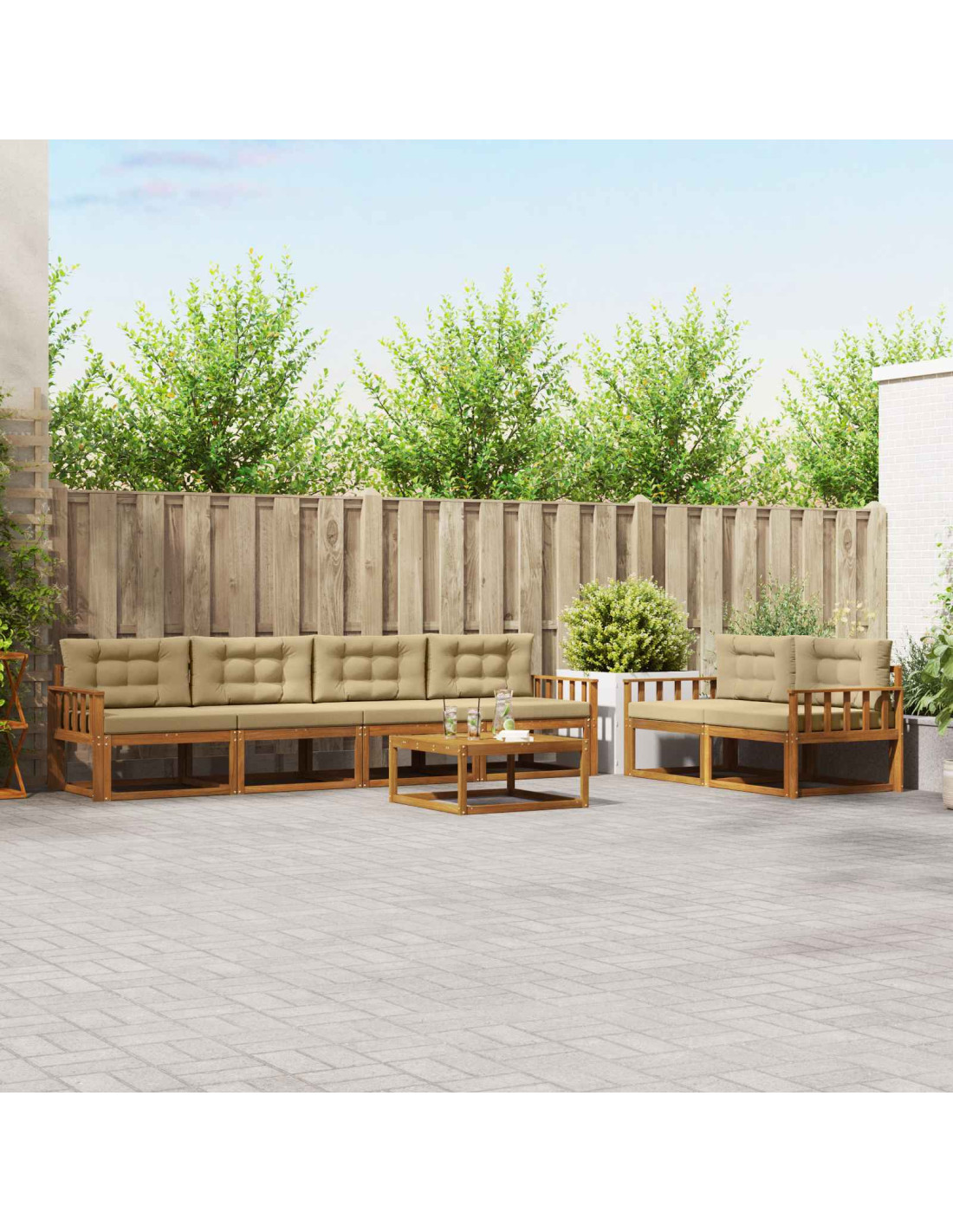 Questo Set di Sofà Sezionale da Esterno è perfetto per trasformare il tuo giardino, patio o area piscina in un angolo di relax. Con il suo design elegante, si adatta facilmente a ogni ambiente esterno. Il design a doghe favorisce la circolazione dell'aria, creando un'atmosfera accogliente per chiacchierate al sole o serate sotto le stelle. Legno massello di Acacia: Costruito con legno massello di Acacia, questo set è noto per la sua resistenza e naturale capacità di resistere agli agenti atmosferici. Le calde nuances del legno ne esaltano il fascino, unendo lusso e durabilità in ogni spazio esterno. Panoramica dei componenti: Grazie al design con schienale a doghe e telaio fisso, il set offre sia stile che robustezza. I braccioli, lo schienale e le superfici sono realizzati in legno massello di Acacia, garantendo un aspetto uniforme e duraturo nel tempo. Design delle caratteristiche funzionali: Questo set modulare può essere facilmente riorganizzato per adattarsi alle tue esigenze. Ogni pezzo ha uno schienale di supporto e un design a doghe, che non solo aggiungono bellezza ma anche comfort. Raccomandato per uso all'aperto: Ideale in giardini, patii e accanto alla piscina, questo set è pensato per giornate di relax. Le sue proprietà resistenti agli agenti atmosferici garantiscono longevità, rendendolo un'ottima scelta per chi ama vivere all'aperto. Manutenzione e cura: Per mantenere il set al meglio, evita la luce solare diretta e utilizzalo con una copertura quando non è in uso. Pulisci regolarmente con un panno umido per preservarne la bellezza e la funzionalità negli anni.