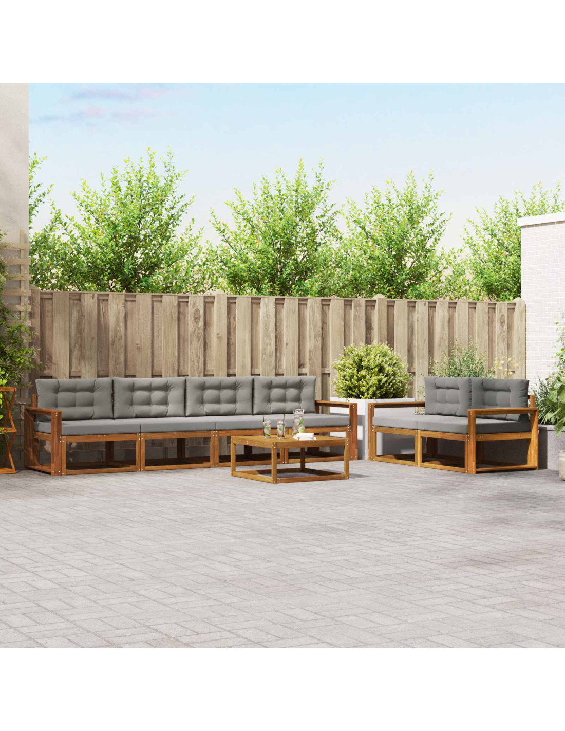 Questo Set di Sofà Sezionale da Esterno è perfetto per trasformare il tuo giardino, patio o area piscina in un angolo di relax. Con il suo design elegante, si adatta facilmente a ogni ambiente esterno. Il design a doghe favorisce la circolazione dell'aria, creando un'atmosfera accogliente per chiacchierate al sole o serate sotto le stelle. Legno massello di Acacia: Costruito con legno massello di Acacia, questo set è noto per la sua resistenza e naturale capacità di resistere agli agenti atmosferici. Le calde nuances del legno ne esaltano il fascino, unendo lusso e durabilità in ogni spazio esterno. Panoramica dei componenti: Grazie al design con schienale a doghe e telaio fisso, il set offre sia stile che robustezza. I braccioli, lo schienale e le superfici sono realizzati in legno massello di Acacia, garantendo un aspetto uniforme e duraturo nel tempo. Design delle caratteristiche funzionali: Questo set modulare può essere facilmente riorganizzato per adattarsi alle tue esigenze. Ogni pezzo ha uno schienale di supporto e un design a doghe, che non solo aggiungono bellezza ma anche comfort. Raccomandato per uso all'aperto: Ideale in giardini, patii e accanto alla piscina, questo set è pensato per giornate di relax. Le sue proprietà resistenti agli agenti atmosferici garantiscono longevità, rendendolo un'ottima scelta per chi ama vivere all'aperto. Manutenzione e cura: Per mantenere il set al meglio, evita la luce solare diretta e utilizzalo con una copertura quando non è in uso. Pulisci regolarmente con un panno umido per preservarne la bellezza e la funzionalità negli anni.