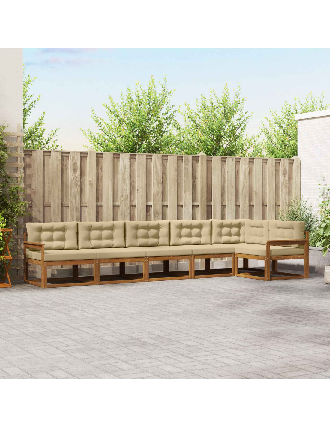 Questo set di divani per esterni dà un tocco moderno a qualsiasi giardino o patio. Progettato con uno stile minimalista, si adatta perfettamente a diversi spazi all'aperto. Le sue configurazioni modulari permettono di personalizzare l'assetto, rendendolo ideale per ogni esigenza. Costruito con attenzione al dettaglio, offre una solida presenza in ogni area esterna. Legno massello di acacia: Ogni pezzo è fatto di legno massello di acacia, conosciuto per la sua forza e bellezza naturale. Le sue tonalità calde aggiungono eleganza, mentre la resistenza garantisce una lunga durata, rendendolo perfetto per gli esterni. Design a listelli: Lo schienale e il telaio a listelli non solo sono belli da vedere, ma assicurano anche un buon flusso d'aria, rendendo le sedute confortevoli nelle giornate calde. Le doghe create con cura offrono un mix di stile classico e moderno. Schienale di supporto: Questo schienale migliora la postura, permettendo sedute ergonomiche e confortevoli. Invita a rilassarsi e a socializzare con stile. Capacità modulari: Questo set modulare offre la possibilità di riconfigurare i posti a sedere in base ai propri bisogni, perfetto per accogliere gli amici o per creare angoli più intimi. Manutenzione e cura: Questo set si pulisce facilmente con un panno umido. Se non lo usi, coprilo durante i periodi di maltempo per mantenerlo in ottime condizioni.