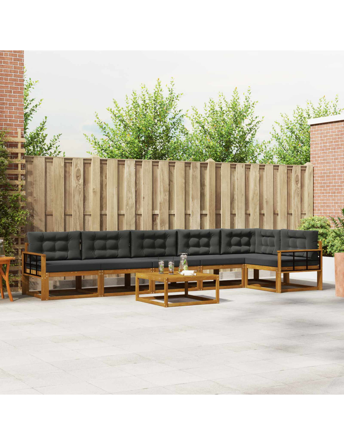 Questo elegante Outdoor Sectional Sofa Set unisce stile e funzionalità, perfetto per valorizzare qualsiasi giardino o patio. Con un design semplice, il legno di acacia gli conferisce un aspetto caldo e accogliente, ideale per riunioni familiari o serate tranquille all'aperto. Le linee pulite e il design minimale creano un'atmosfera contemporanea, ideale per ogni spazio esterno. Approfitta dell'equilibrio tra materiali resistenti e design bello, perfetto per accogliere amici o per goderti una serata tranquilla nel tuo giardino. Costruzione in acacia: Realizzato in robusto legno massello di acacia, il set di divani ha una finitura naturale che si integra perfettamente con gli spazi esterni. Questo legno è noto per la sua resistenza a diverse condizioni atmosferiche, mantenendo la sua bellezza nel tempo. La tonalità marrone naturale aggiunge calore al giardino, mantenendo durabilità e facilità di manutenzione. Schienale di supporto: Lo schienale a doghe è progettato per garantire comfort e un tocco di eleganza. Supporta bene la postura e offre comodità anche per periodi prolungati. Il design favorisce anche una buona circolazione dell'aria, migliorando l'uso senza compromettere l'estetica. Bracciolo pratico: I braccioli in legno massello di acacia offrono supporto extra per chi cerca comfort. Sia che tu stia vivendo un pomeriggio tranquillo o intrattenendo amici, assicurano un'esperienza di relax. Completano il look moderno e offrono comfort durante le conversazioni lunghe. Installazione versatile: Grazie al design modulare, il divano può essere riconfigurato facilmente per adattarsi a varie occasioni. Goditi l'adattabilità della disposizione, che si integra perfettamente in ogni spazio, da angoli accoglienti a aree sociali ampie, senza limitazioni. Manutenzione semplice: Mantieni l'aspetto del set pulendolo con un panno umido e coprendolo quando non ti serve. Tienilo all'ombra o al coperto durante il maltempo per allungarne la vita. Questo assicura eleganza e prestazioni durature negli anni.