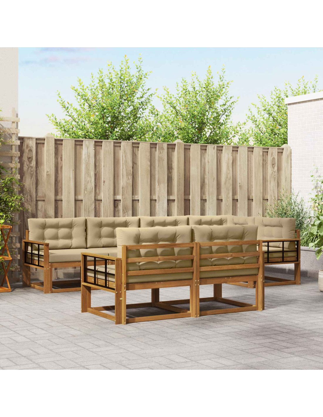 Questo set di sofà sezionale da esterno unisce stile e versatilità, trasformando qualsiasi giardino, patio o area piscina in un angolo accogliente. Grazie al design modulare, puoi adattarlo come vuoi, a seconda del tuo spazio e dei tuoi gusti. Il set ha un caldo colore marrone e la bellezza del legno massello di acacia, che offre sia un aspetto attraente che durata nel tempo. Materiali premium: È costruito in legno massello di acacia, resistente agli agenti atmosferici, per offrirti una solida superficie di seduta all'aperto. Questo legno non solo ha un bell'aspetto, ma mantiene anche la sua integrità nel tempo, rendendolo ideale per giardini o aree piscina. Componenti inclusi: Con uno schienale a doghe e una struttura robusta, il divano offre un ottimo supporto senza compromettere il comfort. I braccioli rendono il relax ancora più puro, perfetto per godersi il tempo libero. Anche se non è flessibile, il design combina alla grande stile e praticità, il che lo rende un ottimo centro per i tuoi spazi esterni. Caratteristiche funzionali: Grazie alla configurazione modulare, puoi personalizzare il layout dei posti a sedere secondo il tuo spazio e le tue esigenze. Puoi optare per un divano compatto in un piccolo patio o un ampio set per ospitare gli amici, il che offre grande flessibilità nel design e nell'uso. Usi raccomandati: Perfetto per feste all'aperto, che siano eventi estivi vivaci o momenti di relax per leggere. La sua versatilità lo rende ideale per giardini, patii e aree piscina, aggiungendo eleganza a ogni spazio. È adatto sia per l'uso residenziale che per eventi di ospitalità, creando un'atmosfera accogliente per amici e famiglie. Manutenzione semplice: Mantieni il sofà pulito con un panno umido e usa una copertura quando è sotto il sole o non lo utilizzi. Questi semplici passaggi assicurano che il set rimanga prezioso nel tuo spazio esterno, riducendo l'usura legata alle intemperie.