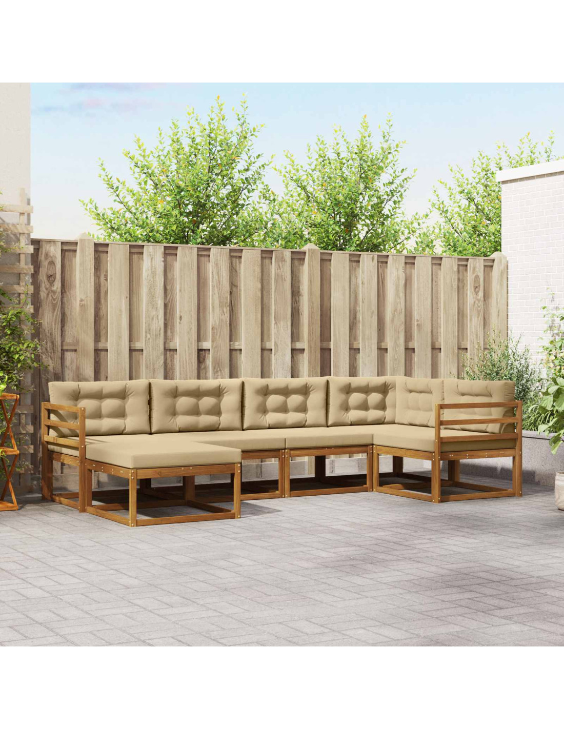 Questo set di divani per esterni è pensato per giardini e patii ed è il mix perfetto di stile e utilità, fornendo un modo elegante per sedersi all'aperto. Con un design moderno e fatto in legno massello di acacia, ha una forma minimalista che si adatta sia ai momenti di relax che a quelli sociali. È una scelta ideale per serate in piscina o pomeriggi tranquilli in giardino. Legno massello di acacia: Esso garantisce durabilità e naturale resistenza agli agenti atmosferici, mantenendo il set robusto in ogni situazione e aggiungendo un tocco elegante agli spazi esterni. Design a doghe: Questo set non è solo bello, ma anche pratico. Le doghe migliorano la ventilazione per mantenerti fresco e impedire l'umidità. Aggiungono anche uno stile distintivo al tuo patio. Schienale di supporto: La forma a doghe favorisce una postura corretta, facendoti star comodo durante lunghe chiacchierate o letture. Puoi stare sicuro di essere sostenuto in qualsiasi momento. Flessibilità modulare: Puoi facilmente riadattare il set per ogni occasione, sia per una festa che per momenti di relax. La sua capacità di adattamento lo rende un'ottima scelta per vari ambienti esterni. Semplicità di manutenzione: È semplice da tenere pulito: basta un panno umido e usare una copertura quando non lo usi. Così, il set resta bello e duraturo senza fatica!