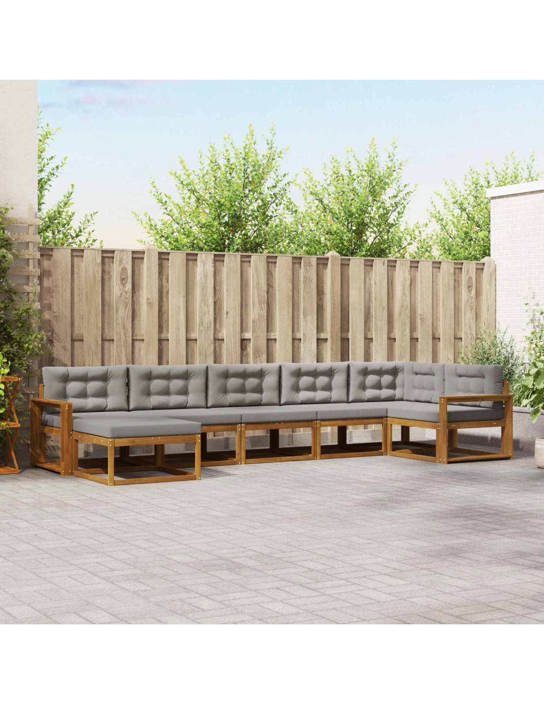 Questo set di divani per esterni è l'aggiunta perfetta per il tuo spazio all'aperto, unendo stile e funzionalità senza sforzo. Con linee moderne e forme pulite, è ideale per oziare, intrattenere o semplicemente rilassarsi in giardino o a bordo piscina. Le tonalità terrose e le texture naturali si integrano bene con la natura, creando l'atmosfera ideale per riunioni di famiglia o momenti di relax. Materiali di Qualità: Realizzato in legno massello di acacia, resistente e durevole, questo set di divani è progettato per resistere agli agenti atmosferici e mantenere la sua bellezza nel tempo. La venatura naturale del legno aggiunge raffinatezza agli spazi esterni, un mix di eleganza e robustezza che ne garantisce la longevità. Struttura Slattata Funzionale: Il telaio a doghe fisse garantisce stabilità e supporta i posti a sedere. Anche se non è regolabile, offre una buona ventilazione, aiutando a mantenere i mobili asciutti e facili da mantenere. Questa caratteristica offre un perfetto equilibrio tra prezzo e praticità. Comodo Comfort: Con uno schienale a doghe e braccioli pratici, questo set offre un grande sostegno per rilassarsi in qualsivoglia occasione. Lo schienale favorisce l'allineamento della colonna vertebrale, mentre i braccioli ergonomici ti consentono di riposare naturalmente, rendendo il set funzionale per un uso prolungato. Configurazione Adattabile: Il design modulare ti permette di creare configurazioni personalizzate, adattandosi a occasioni diverse. Che tu stia organizzando un grande evento all'aperto o godendoti un'area intima, questa flessibilità massimizza l'uso e ottimizza lo spazio. Cura e Manutenzione Esterna: Per mantenerlo al meglio, rimuovi polvere e detriti con un panno morbido e umido. Quando non lo usi, coprilo con un telo per proteggerlo dal sole, allungando così la sua vita e mantenendolo in ottimo stato in ogni stagione.