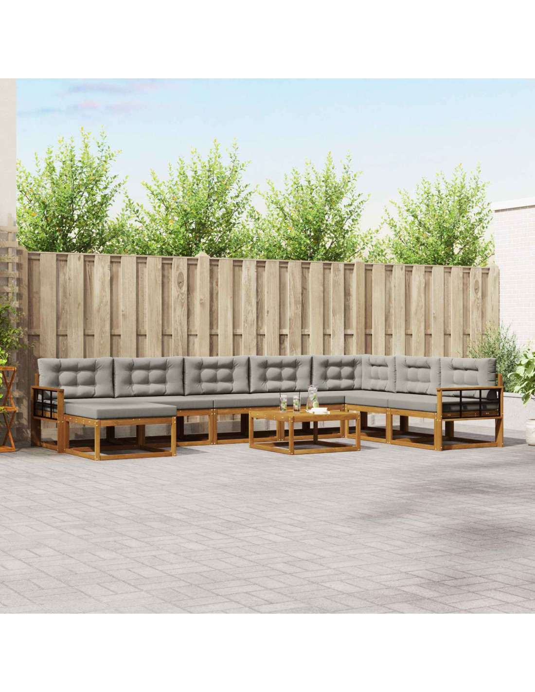 Questo set di divani sezionali per esterni è pensato per migliorare l’aspetto e la funzionalità del tuo giardino, patio, area piscina o cortile. Unisce eleganza e utilità con linee pulite e uno stile moderno. Creato per il relax all'aperto, offre ampio spazio per incontrare amici o goderti momenti da solo. Legno Di Acacia Durevole: Realizzato in legno massello di acacia di alta qualità, questo divano è pensato per durare. Il legno di acacia è noto per la sua resistenza, rendendolo perfetto per mobili da esterno. La sua struttura robusta offre stabilità senza sacrificare lo stile, mantenendo l'aspetto elegante nel tempo. Design Con Schienale a Doghe Di Supporto: Il divano ha uno schienale slatted in legno massello di acacia, che offre un ottimo supporto e rende confortevole l'uso prolungato. Questo design non solo è bello ma migliora anche la circolazione dell'aria, per un comfort superiore nei giorni caldi. Caratteristiche Pratiche Dei Braccioli: I braccioli sono robusti e in legno massello di acacia, progettati per il massimo comfort. Sono una comoda aggiunta al divano, permettendo di rilassare le braccia in modo naturale durante lettura, chiacchiere o mentre gusti un drink. Design Moderno E Funzionale: Questo set di divani combina semplicità moderna e funzionalità, perfettamente adatto a vari spazi esterni. Il colore marrone elegante del legno di acacia si integra bene con diversi stili di arredamento. Facile Manutenzione: Questo set è semplice da mantenere. Bastano un panno umido per le pulizie e una copertura quando non lo usi. È meglio tenerlo lontano dal sole diretto per preservarlo.