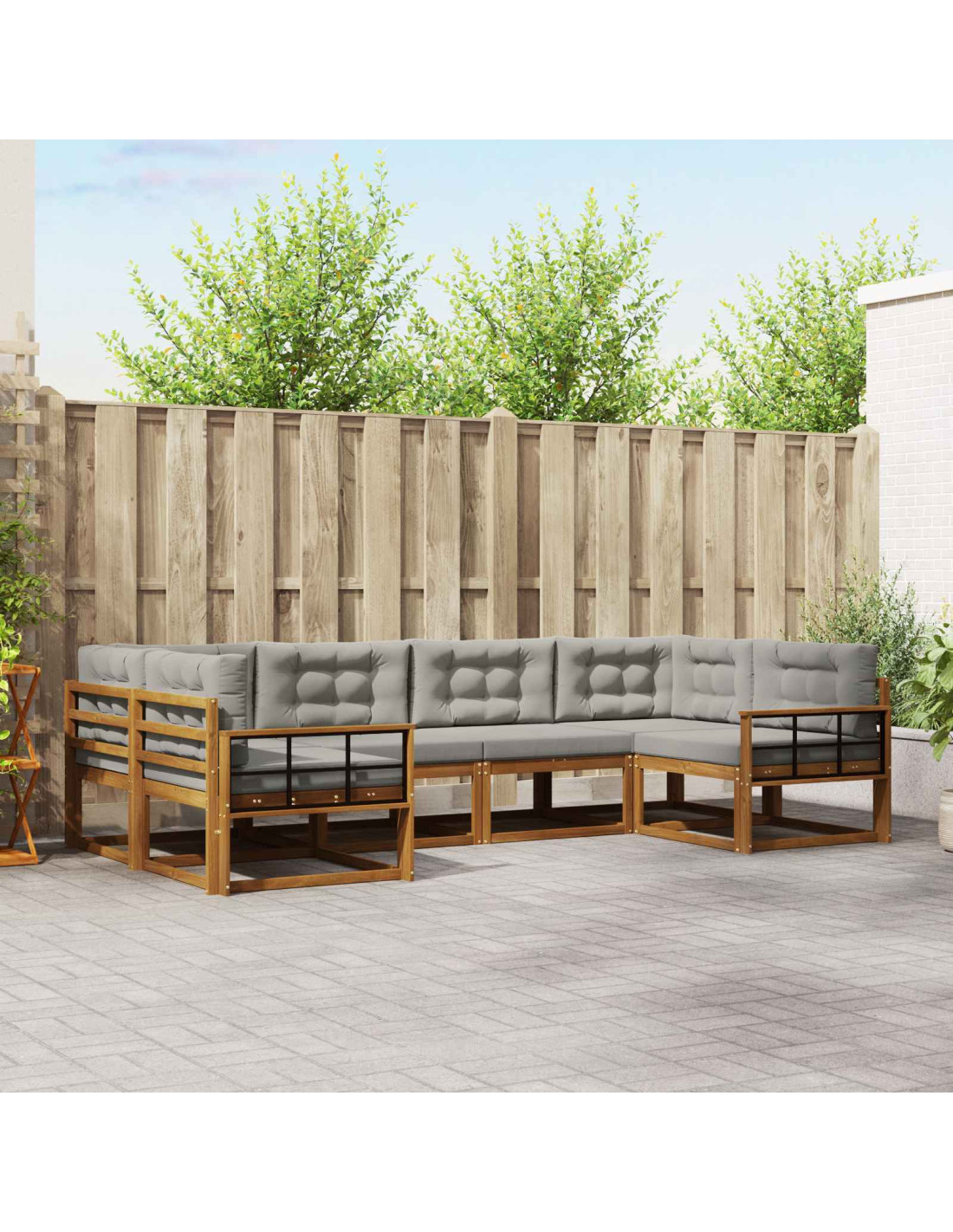 Questo set di divani modulari è moderno e funzionale, ideale per aggiungere un tocco speciale a giardini, patii, cortili o aree a bordo piscina. La struttura in legno massello di acacia e il design a doghe invitano al relax. Le linee semplici e il look minimalista fanno sì che si integri perfettamente in qualsiasi spazio esterno, offrendo una disposizione elegante e comoda per socializzare o godersi momenti di relax. Composizione in legno massello di acacia: Ogni pezzo è fatto di legno massiccio di acacia, noto per la sua robustezza e durata. Questo materiale resiste a diverse condizioni climatiche, garantendo una lunga vita. Il colore marrone ricco si abbina bene con l'ambiente esterno, portando eleganza alla tua area di seduta. Design pratico dei braccioli: I braccioli sono progettati per il massimo comfort, perfetti per rilassarti senza rinunciare alla funzionalità. Questa attenzione al dettaglio rende piacevole goderti ore di relax. Schienale a doghe di supporto: Il design a doghe dello schienale offre un supporto ergonomico. Queste doghe permettono alla struttura di rimanere traspirante, offrendo comfort duraturo. La semplicità del design arricchisce l'aspetto di qualsiasi spazio esterno. Utilizzo multiplo in ambienti esterni: Questo set modulare è progettato per molteplici luoghi: giardini, patii o aree a bordo piscina. Il suo stile moderno si integra facilmente in diversi ambienti, fornendo una soluzione elegante per sedute all'aperto. È perfetto per pomeriggi di relax o vivaci riunioni. Procedure di manutenzione semplificate: La manutenzione di questo set è facile: basta passarlo con un panno umido e usare una copertura protettiva. Evitare l'esposizione diretta al sole aiuta a preservarne la condizione, così il set continuerà a essere un punto focale del tuo spazio esterno negli anni a venire.