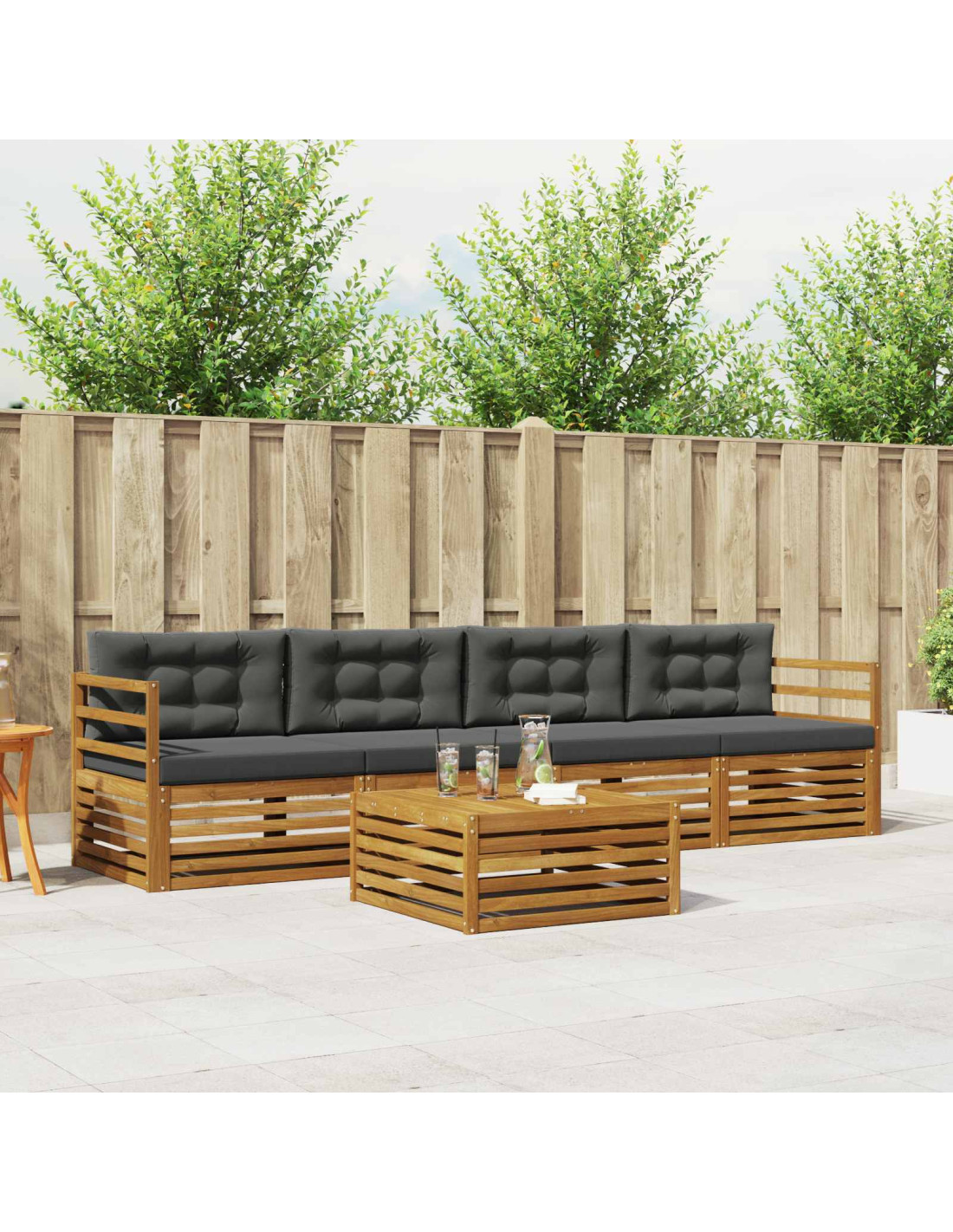 Il set di mobili da esterno unisce stile e funzionalità, creando un colpo d'occhio per qualsiasi giardino o terrazza. Il design moderno con linee pulite e dettagli semplici aggiunge eleganza e supporta il relax all'aperto e le riunioni sociali. Interamente in legno massello di acacia, questo set è resistente e mantiene il suo aspetto nel tempo, ideale per chi cerca praticità e un design raffinato. Legno massello di acacia resistente: Questo set di mobili da esterno è realizzato in legno massello di acacia, noto per la sua durabilità. La struttura robusta assicura stabilità e il calore del legno arricchisce qualsiasi giardino. Design resistente alle intemperie: La superficie verniciata offre protezione contro sole e pioggia leggera. La finitura lucida mantiene aspetto e funzionalità nel tempo, perfetta per giardini e terrazze. Componenti e design: Ogni pezzo è progettato per stile e funzionalità, con supporti aggiuntivi per maggiore comfort e un design armonioso adatto a eventi all'aperto. Comfort e versatilità: Con il suo design modulare, questo set è flessibile e si adatta a vari spazi. Perfetto per rilassarsi o socializzare, si integra facilmente in qualsiasi ambiente esterno. Facile manutenzione: Per mantenere i mobili, basta pulire con un panno umido e evitare detergenti aggressivi. Una cura costante fa durare di più i mobili.