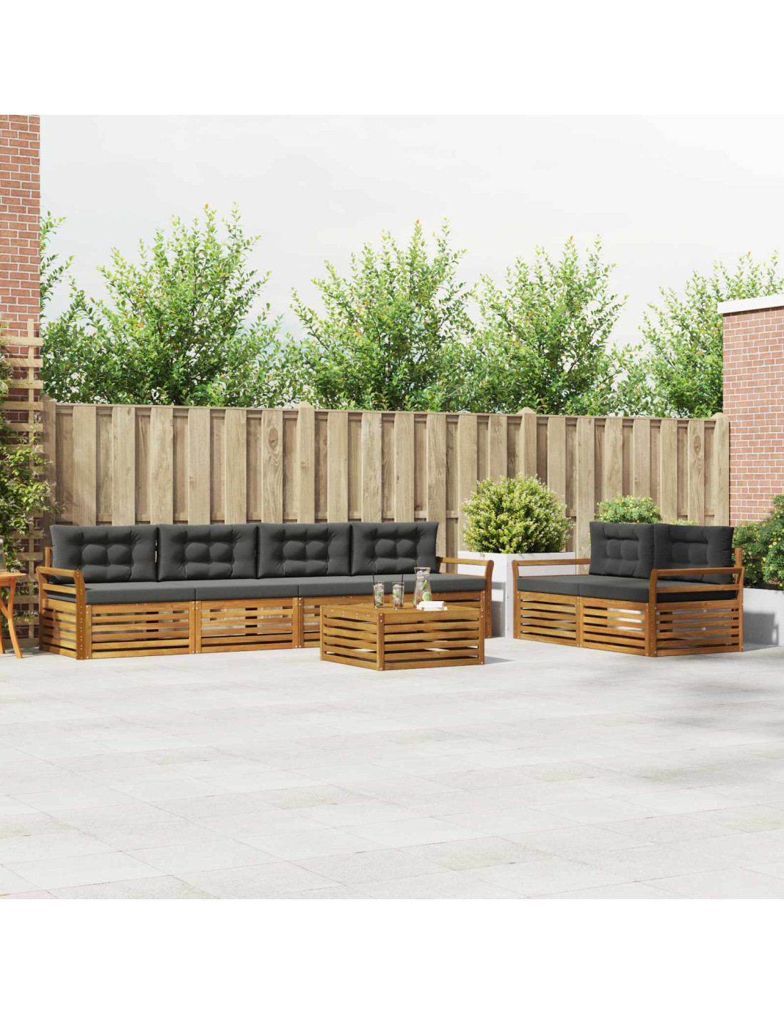 Il set di mobili da esterno unisce stile e praticità, creando un angolo fantastico per qualsiasi giardino o terrazza. Il suo design moderno, caratterizzato da linee pulite e dettagli minimalisti, aggiunge un tocco di eleganza mentre favorisce il relax e le riunioni all'aperto. Realizzato in legno massello di Acacia, è super resistente e ha un aspetto che dura nel tempo, quindi è perfetto per chi cerca sia funzionalità che bellezza nei mobili da esterno. Legno di Acacia Massiccio e Durevole: Fatto di legno di Acacia massiccio, questo set di mobili per esterni è robusto e resiste bene alle intemperie. La costruzione solida offre supporto e stabilità duraturi, mentre la calda tonalità naturale si abbina perfettamente a giardini e terrazze. Design Resistente alle Intemperie: Questo set di mobili da esterno ha una superficie trattata che fornisce una protezione extra contro sole e pioggia leggera. La finitura lucida mantiene sia l’aspetto che la funzionalità, garantendo durevolezza nel tempo per giardini, terrazze e cortili. Componenti e Design: Ogni pezzo, dai braccioli agli schienali, è progettato per unire stile e funzionalità. Le caratteristiche di supporto offrono comfort extra, mentre il design coeso assicura un aspetto armonioso, perfetto per ogni evento all'aperto. Comfort e Versatilità: Il design modulare permette di adattarlo facilmente a spazi e bisogni vari. È perfetto per rilassarsi, fare feste o ritagliarsi un momento di lettura tranquilla, adattandosi bene a qualsiasi spazio esterno con comfort e praticità. Facile Manutenzione: Per mantenere i mobili in ottimo stato, basta pulire la superficie con un panno umido, evitando detergenti aggressivi. Una cura regolare manterrà il loro aspetto e prolungherà la vita dei mobili.