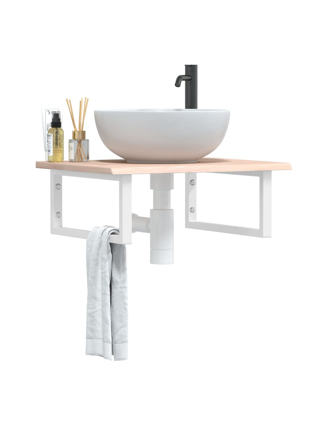 Il ripiano per lavabo a parete si fissa saldamente alla parete, offrendo una soluzione elegante e salvaspazio per il vostro bagno. Robusto e duraturo: questo ripiano per lavabo è combinato con una struttura in acciaio e un piano in legno massello di rovere, che lo rendono robusto, stabile e duraturo.Salvaspazio: il ripiano lavabo sospeso ha ampio spazio per riporre creme e piccoli oggetti. Grazie alla forma rettangolare, potete appendere asciugamani o altro sul supporto per risparmiare spazio.Facile da usare: il piano di lavoro non è forato per consentire il montaggio del lavabo a sinistra, a destra o al centro, a seconda delle esigenze della stanza. Grazie ai fori predisposti nel supporto, può essere facilmente assemblato con il piano e montato a parete.Ampie applicazioni: grazie al suo design moderno, offre spazio aggiuntivo per vari tipi di bagni. Buono a sapersi:Le viti non sono incluse, è possibile acquistarle separatamente in base alle informazioni fornite di seguito.Fissaggio a parete: 2 viti di espansione M8 per staffaPiano in legno: 2 viti M5x18 (T=2) o 2 viti M5x20 (T=2,5/4cm) per staffaEssendo un prodotto naturale, il legno può presentare nodi e imperfezioni che riempiamo con riempimenti neri per garantire un aspetto liscio.