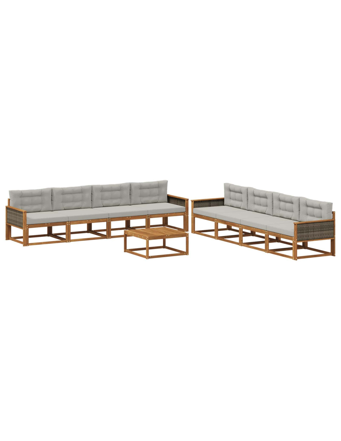 Questo elegante set di divani modulari per esterni trasforma il tuo giardino, patio o area piscina in un luogo di comfort e stile. Realizzato in legno massello di acacia, noto per la sua durata e calore, il set presenta un'affascinante tonalità marrone con un design moderno. La sua forma accogliente invita a rilassarsi e stare insieme. Che tu stia organizzando una festa o cercando un posto dove rifugiarti, questo set bilancia utilità ed estetica, regalando un'esperienza serena all'aperto. Composizione in legno di acacia: Questo set di divani è fatto in legno massello di acacia, famoso per la sua resistenza e bellezza naturale. La sua grana elegante e il colore caldo si integrano perfettamente con l'ambiente esterno, aggiungendo un tocco di rusticità. Struttura a doghe fisse: Perfetto per l'esterno, questo set ha una robusta struttura a doghe fisse. Le doghe sono progettate per drenare l'acqua, proteggendo il divano dai danni della pioggia. Questo design non solo offre solidità ma mantiene il divano comodo sia al sole che all'ombra. Proprietà resistenti alle intemperie: Creato per l'uso esterno, il set ha qualità resistenti alle intemperie, proteggendolo dalla pioggia e dal sole. Che ci siano tempeste estive o forti raggi UV, il set mantiene la sua bellezza e integrità, offrendoti una soluzione comoda all'aperto che richiede poca manutenzione. Assemblaggio facile: Mettere insieme il set è semplice e richiede solo due persone e un cacciavite. Le istruzioni sono chiare, rendendo il montaggio un compito veloce, così potrai goderti subito i tuoi nuovi mobili. Questo metodo pratico rende il tutto facile per chi deve montare il set nel proprio spazio esterno. Consigliamo cura regolare: Anche se è resistente, il set gode di un po'di manutenzione per mantenere la sua bellezza. Usare coperture protettive quando non lo usi e pulirlo con un panno umido aiuteranno a mantenerlo fresco. Questa cura può allungare la vita dei mobili e mantenere l'eleganza e il comfort che dovrebbero portare nel tuo spazio.