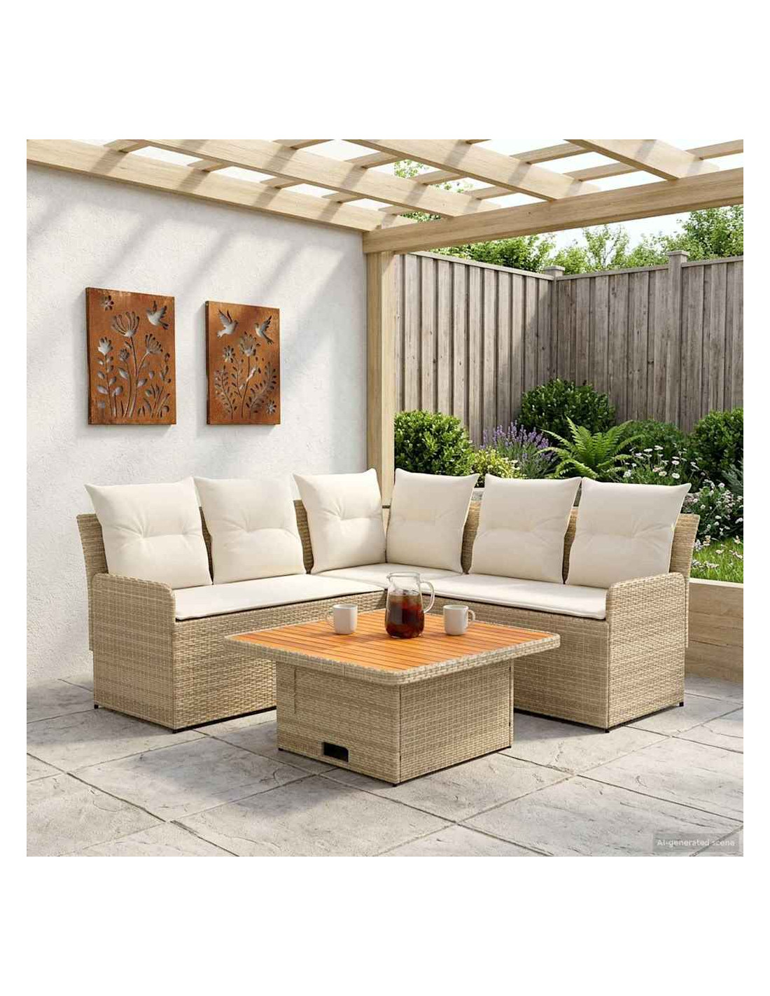 Questo set di mobili moderni è progettato per adattarsi a spazi interni ed esterni. Con un focus sulla semplicità e sulla funzionalità, presenta linee pulite e pochi fronzoli, aumentando il suo fascino contemporaneo. Costruito in rattan PE e legno massello di acacia, porta un tocco moderno ovunque, perfetto per godere di momenti di svago con amici e familiari. Che sia su un patio o in soggiorno, si adatta a diversi stili d'interni, unendo resistenza e design. La calda finitura marrone e i morbidi cuscini creano un ambiente accogliente di relax, rendendo i momenti confortevoli ancora più piacevoli. Materiali: Fatto in rattan PE, questo set non solo è bello da vedere grazie al design intrecciato, ma è anche pratico grazie alla resistenza agli agenti atmosferici. Il rattan PE è noto per la sua durata contro raggi UV e umidità, garantendo un utilizzo prolungato. Inoltre, presenta una robusta struttura in acciaio verniciato, per supporto affidabile e peso leggero, perfetto per posizionamenti flessibili. Componenti Inclusi: Dotato di comodi cuscini con coperture removibili, il set di mobili è facile da mantenere. La schiuma e la fibra di poliestere offrono comfort per lunghe ore di relax. I cuscini removibili e chiusi con zip rendono la pulizia un gioco da ragazzi, mentre l'aspetto simile a cuscini arricchisce l'atmosfera di qualsiasi ambiente. Caratteristiche / Funzioni / Design: Progettato con piedi regolabili, il set si adatta facilmente su terreni irregolari, assicurando stabilità e sicurezza ovunque lo metti. Questa comodità aggiunge versatilità, permettendo di utilizzarlo in molte situazioni, sia in interno che in esterno. Usi Raccomandati: Perfetto per patios, terrazze, giardini o spazi interni, questo set si adatta strategicità a vari contesti. Il suo design moderno e le tonalità neutre lo rendono ideale per chi ama festeggiare all'aperto o semplicemente rilassarsi dentro casa. Manutenzione: Si consiglia di pulire solo con metodi asciutti per evitare sostanze chimiche aggressive che possono danneggiare la superficie. Coprendo il set con una protezione impermeabile quando non viene usato, garantirai la sua durata e manterrai la sua condizione agevolmente, specialmente in caso di mal tempo.