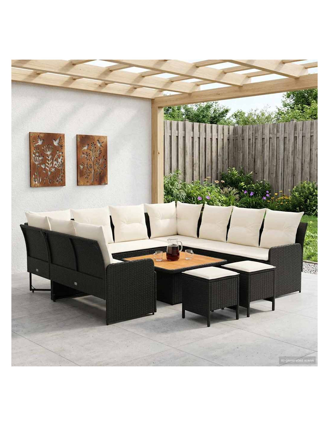 Questo set di mobili moderni è progettato per adattarsi a spazi interni ed esterni. Con un focus sulla semplicità e sulla funzionalità, presenta linee pulite e pochi fronzoli, aumentando il suo fascino contemporaneo. Costruito in rattan PE e legno massello di acacia, porta un tocco moderno ovunque, perfetto per godere di momenti di svago con amici e familiari. Che sia su un patio o in soggiorno, si adatta a diversi stili d'interni, unendo resistenza e design. La calda finitura marrone e i morbidi cuscini creano un ambiente accogliente di relax, rendendo i momenti confortevoli ancora più piacevoli. Materiali: Fatto in rattan PE, questo set non solo è bello da vedere grazie al design intrecciato, ma è anche pratico grazie alla resistenza agli agenti atmosferici. Il rattan PE è noto per la sua durata contro raggi UV e umidità, garantendo un utilizzo prolungato. Inoltre, presenta una robusta struttura in acciaio verniciato, per supporto affidabile e peso leggero, perfetto per posizionamenti flessibili. Componenti Inclusi: Dotato di comodi cuscini con coperture removibili, il set di mobili è facile da mantenere. La schiuma e la fibra di poliestere offrono comfort per lunghe ore di relax. I cuscini removibili e chiusi con zip rendono la pulizia un gioco da ragazzi, mentre l'aspetto simile a cuscini arricchisce l'atmosfera di qualsiasi ambiente. Caratteristiche / Funzioni / Design: Progettato con piedi regolabili, il set si adatta facilmente su terreni irregolari, assicurando stabilità e sicurezza ovunque lo metti. Questa comodità aggiunge versatilità, permettendo di utilizzarlo in molte situazioni, sia in interno che in esterno. Usi Raccomandati: Perfetto per patios, terrazze, giardini o spazi interni, questo set si adatta strategicità a vari contesti. Il suo design moderno e le tonalità neutre lo rendono ideale per chi ama festeggiare all'aperto o semplicemente rilassarsi dentro casa. Manutenzione: Si consiglia di pulire solo con metodi asciutti per evitare sostanze chimiche aggressive che possono danneggiare la superficie. Coprendo il set con una protezione impermeabile quando non viene usato, garantirai la sua durata e manterrai la sua condizione agevolmente, specialmente in caso di mal tempo.