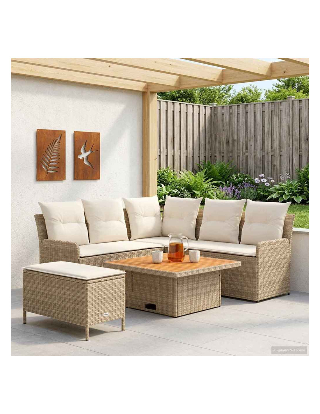 Questo set di mobili moderni è progettato per adattarsi a spazi interni ed esterni. Con un focus sulla semplicità e sulla funzionalità, presenta linee pulite e pochi fronzoli, aumentando il suo fascino contemporaneo. Costruito in rattan PE e legno massello di acacia, porta un tocco moderno ovunque, perfetto per godere di momenti di svago con amici e familiari. Che sia su un patio o in soggiorno, si adatta a diversi stili d'interni, unendo resistenza e design. La calda finitura marrone e i morbidi cuscini creano un ambiente accogliente di relax, rendendo i momenti confortevoli ancora più piacevoli. Materiali: Fatto in rattan PE, questo set non solo è bello da vedere grazie al design intrecciato, ma è anche pratico grazie alla resistenza agli agenti atmosferici. Il rattan PE è noto per la sua durata contro raggi UV e umidità, garantendo un utilizzo prolungato. Inoltre, presenta una robusta struttura in acciaio verniciato, per supporto affidabile e peso leggero, perfetto per posizionamenti flessibili. Componenti Inclusi: Dotato di comodi cuscini con coperture removibili, il set di mobili è facile da mantenere. La schiuma e la fibra di poliestere offrono comfort per lunghe ore di relax. I cuscini removibili e chiusi con zip rendono la pulizia un gioco da ragazzi, mentre l'aspetto simile a cuscini arricchisce l'atmosfera di qualsiasi ambiente. Caratteristiche / Funzioni / Design: Progettato con piedi regolabili, il set si adatta facilmente su terreni irregolari, assicurando stabilità e sicurezza ovunque lo metti. Questa comodità aggiunge versatilità, permettendo di utilizzarlo in molte situazioni, sia in interno che in esterno. Usi Raccomandati: Perfetto per patios, terrazze, giardini o spazi interni, questo set si adatta strategicità a vari contesti. Il suo design moderno e le tonalità neutre lo rendono ideale per chi ama festeggiare all'aperto o semplicemente rilassarsi dentro casa. Manutenzione: Si consiglia di pulire solo con metodi asciutti per evitare sostanze chimiche aggressive che possono danneggiare la superficie. Coprendo il set con una protezione impermeabile quando non viene usato, garantirai la sua durata e manterrai la sua condizione agevolmente, specialmente in caso di mal tempo.