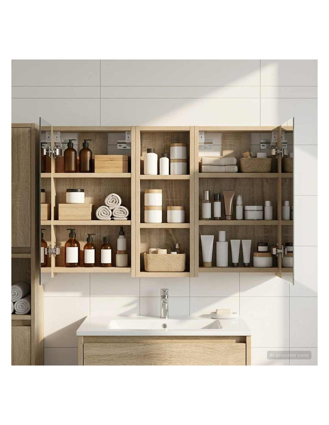 Questo set di armadi moderni per il bagno è il massimo in fatto di stile, combinando un design chic con funzioni pratiche. Creato per chi vive nella modernità, funge sia da spazio di stoccaggio che da decorazione bella, integrandosi perfettamente in ogni bagno. Con tanto spazio grazie alla sua struttura montata a parete, libera il pavimento, rendendo tutto facile da raggiungere. Il set di armadi dà un tocco di freschezza al bagno con lo specchio bifacciale e l'illuminazione LED incorporata, creando un ambiente curato e pronto per l'uso. Costruzione in legno ingegnerizzato Questo set è fatto in legno ingegnerizzato, apprezzato per la sua stabilità e resistenza. Non si deforma né si danneggia facilmente, assicurando un pezzo durevole per l'uso quotidiano. La finitura liscia ne facilita la cura, rendendolo un elemento a bassa manutenzione. Spazio di stoccaggio ampio Progettato per l'utilizzo efficiente, l'armadio da bagno offre tanto spazio con ripiani e porte a cerniera. La disposizione intelligente consente di tenere tutto a portata, garantendo un'organizzazione semplice. Il design salva spazio migliora la funzionalità e riduce il disordine. Specchio bifacciale innovativo Con un specchio bifacciale, questo armadio unisce privacy e visibilità. Il lato esterno è uno specchio standard, mentre quello interno permette una visione discreta, aggiungendo un tocco di classe. Questo elemento arricchisce gli interni moderni grazie alla sua doppia funzione. Illuminazione a striscia LED efficiente Dotato di luci LED USB, illumina gli spazi con una luce bella e a risparmio energetico. Le luci aumentano la visibilità, specialmente di notte, creando un'atmosfera serena e accogliente. Ottimo per chi cerca illuminazione moderna accoppiata a mobili funzionali. Manutenzione e cura semplici Mantenere questo set di armadi è facilissimo. Basta usare un panno morbido e asciutto per le superfici, evitando prodotti chimici aggressivi per preservare il materiale. Queste semplici istruzioni di cura assicurano che l'armadio rimanga un pezzo utile e sempre attuale nel tuo bagno.