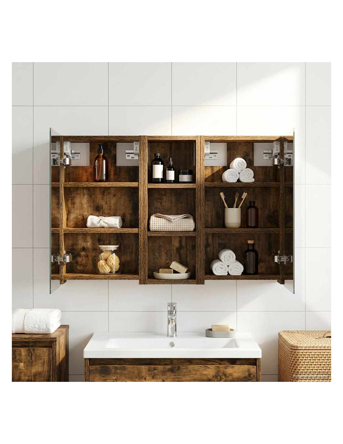 Questo set di armadi moderni per il bagno è il massimo in fatto di stile, combinando un design chic con funzioni pratiche. Creato per chi vive nella modernità, funge sia da spazio di stoccaggio che da decorazione bella, integrandosi perfettamente in ogni bagno. Con tanto spazio grazie alla sua struttura montata a parete, libera il pavimento, rendendo tutto facile da raggiungere. Il set di armadi dà un tocco di freschezza al bagno con lo specchio bifacciale e l'illuminazione LED incorporata, creando un ambiente curato e pronto per l'uso. Costruzione in legno ingegnerizzato Questo set è fatto in legno ingegnerizzato, apprezzato per la sua stabilità e resistenza. Non si deforma né si danneggia facilmente, assicurando un pezzo durevole per l'uso quotidiano. La finitura liscia ne facilita la cura, rendendolo un elemento a bassa manutenzione. Spazio di stoccaggio ampio Progettato per l'utilizzo efficiente, l'armadio da bagno offre tanto spazio con ripiani e porte a cerniera. La disposizione intelligente consente di tenere tutto a portata, garantendo un'organizzazione semplice. Il design salva spazio migliora la funzionalità e riduce il disordine. Specchio bifacciale innovativo Con un specchio bifacciale, questo armadio unisce privacy e visibilità. Il lato esterno è uno specchio standard, mentre quello interno permette una visione discreta, aggiungendo un tocco di classe. Questo elemento arricchisce gli interni moderni grazie alla sua doppia funzione. Illuminazione a striscia LED efficiente Dotato di luci LED USB, illumina gli spazi con una luce bella e a risparmio energetico. Le luci aumentano la visibilità, specialmente di notte, creando un'atmosfera serena e accogliente. Ottimo per chi cerca illuminazione moderna accoppiata a mobili funzionali. Manutenzione e cura semplici Mantenere questo set di armadi è facilissimo. Basta usare un panno morbido e asciutto per le superfici, evitando prodotti chimici aggressivi per preservare il materiale. Queste semplici istruzioni di cura assicurano che l'armadio rimanga un pezzo utile e sempre attuale nel tuo bagno.