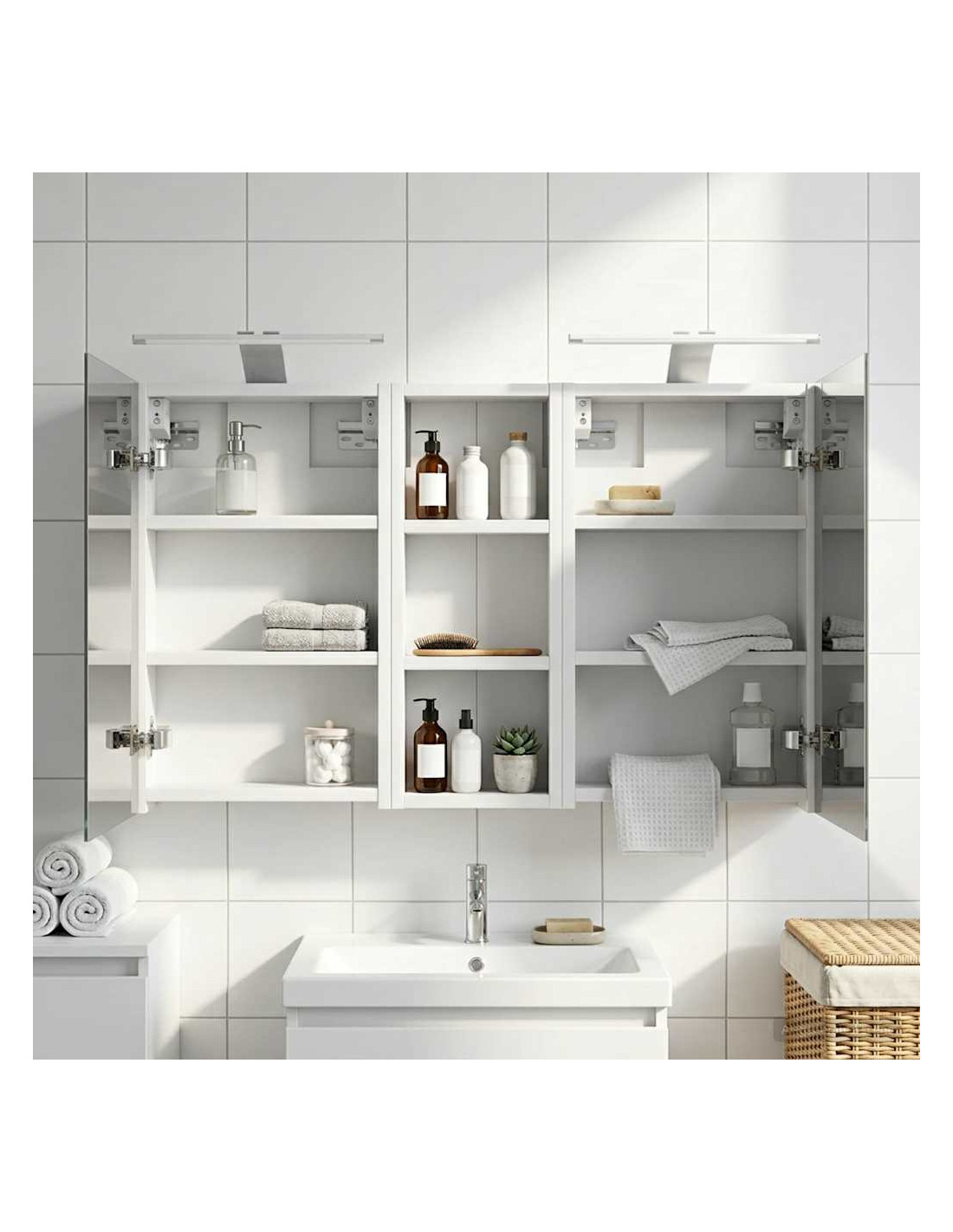 Questo set di armadi moderni per il bagno è il massimo in fatto di stile, combinando un design chic con funzioni pratiche. Creato per chi vive nella modernità, funge sia da spazio di stoccaggio che da decorazione bella, integrandosi perfettamente in ogni bagno. Con tanto spazio grazie alla sua struttura montata a parete, libera il pavimento, rendendo tutto facile da raggiungere. Il set di armadi dà un tocco di freschezza al bagno con lo specchio bifacciale e l'illuminazione LED incorporata, creando un ambiente curato e pronto per l'uso. Costruzione in legno ingegnerizzato Questo set è fatto in legno ingegnerizzato, apprezzato per la sua stabilità e resistenza. Non si deforma né si danneggia facilmente, assicurando un pezzo durevole per l'uso quotidiano. La finitura liscia ne facilita la cura, rendendolo un elemento a bassa manutenzione. Spazio di stoccaggio ampio Progettato per l'utilizzo efficiente, l'armadio da bagno offre tanto spazio con ripiani e porte a cerniera. La disposizione intelligente consente di tenere tutto a portata, garantendo un'organizzazione semplice. Il design salva spazio migliora la funzionalità e riduce il disordine. Specchio bifacciale innovativo Con un specchio bifacciale, questo armadio unisce privacy e visibilità. Il lato esterno è uno specchio standard, mentre quello interno permette una visione discreta, aggiungendo un tocco di classe. Questo elemento arricchisce gli interni moderni grazie alla sua doppia funzione. Illuminazione a striscia LED efficiente Dotato di luci LED USB, illumina gli spazi con una luce bella e a risparmio energetico. Le luci aumentano la visibilità, specialmente di notte, creando un'atmosfera serena e accogliente. Ottimo per chi cerca illuminazione moderna accoppiata a mobili funzionali. Manutenzione e cura semplici Mantenere questo set di armadi è facilissimo. Basta usare un panno morbido e asciutto per le superfici, evitando prodotti chimici aggressivi per preservare il materiale. Queste semplici istruzioni di cura assicurano che l'armadio rimanga un pezzo utile e sempre attuale nel tuo bagno.
