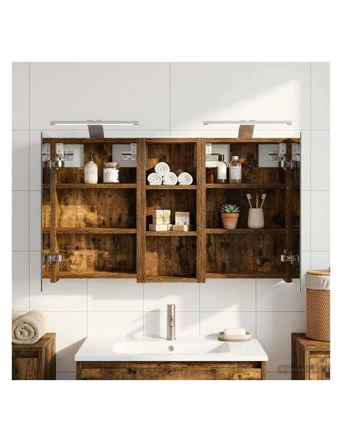 Questo set di armadi moderni per il bagno è il massimo in fatto di stile, combinando un design chic con funzioni pratiche. Creato per chi vive nella modernità, funge sia da spazio di stoccaggio che da decorazione bella, integrandosi perfettamente in ogni bagno. Con tanto spazio grazie alla sua struttura montata a parete, libera il pavimento, rendendo tutto facile da raggiungere. Il set di armadi dà un tocco di freschezza al bagno con lo specchio bifacciale e l'illuminazione LED incorporata, creando un ambiente curato e pronto per l'uso. Costruzione in legno ingegnerizzato Questo set è fatto in legno ingegnerizzato, apprezzato per la sua stabilità e resistenza. Non si deforma né si danneggia facilmente, assicurando un pezzo durevole per l'uso quotidiano. La finitura liscia ne facilita la cura, rendendolo un elemento a bassa manutenzione. Spazio di stoccaggio ampio Progettato per l'utilizzo efficiente, l'armadio da bagno offre tanto spazio con ripiani e porte a cerniera. La disposizione intelligente consente di tenere tutto a portata, garantendo un'organizzazione semplice. Il design salva spazio migliora la funzionalità e riduce il disordine. Specchio bifacciale innovativo Con un specchio bifacciale, questo armadio unisce privacy e visibilità. Il lato esterno è uno specchio standard, mentre quello interno permette una visione discreta, aggiungendo un tocco di classe. Questo elemento arricchisce gli interni moderni grazie alla sua doppia funzione. Illuminazione a striscia LED efficiente Dotato di luci LED USB, illumina gli spazi con una luce bella e a risparmio energetico. Le luci aumentano la visibilità, specialmente di notte, creando un'atmosfera serena e accogliente. Ottimo per chi cerca illuminazione moderna accoppiata a mobili funzionali. Manutenzione e cura semplici Mantenere questo set di armadi è facilissimo. Basta usare un panno morbido e asciutto per le superfici, evitando prodotti chimici aggressivi per preservare il materiale. Queste semplici istruzioni di cura assicurano che l'armadio rimanga un pezzo utile e sempre attuale nel tuo bagno.