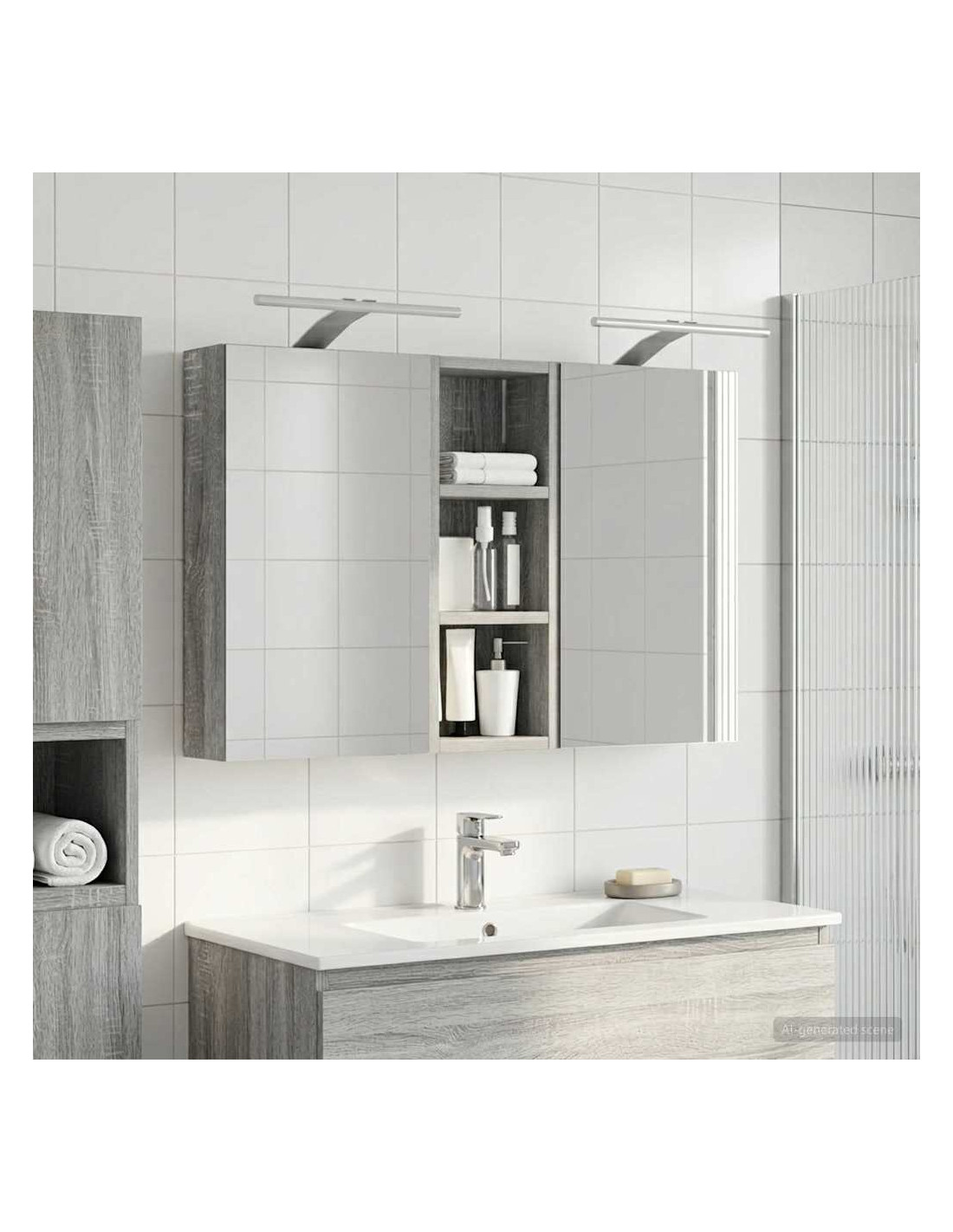 Questo set di armadi moderni per il bagno è il massimo in fatto di stile, combinando un design chic con funzioni pratiche. Creato per chi vive nella modernità, funge sia da spazio di stoccaggio che da decorazione bella, integrandosi perfettamente in ogni bagno. Con tanto spazio grazie alla sua struttura montata a parete, libera il pavimento, rendendo tutto facile da raggiungere. Il set di armadi dà un tocco di freschezza al bagno con lo specchio bifacciale e l'illuminazione LED incorporata, creando un ambiente curato e pronto per l'uso. Costruzione in legno ingegnerizzato Questo set è fatto in legno ingegnerizzato, apprezzato per la sua stabilità e resistenza. Non si deforma né si danneggia facilmente, assicurando un pezzo durevole per l'uso quotidiano. La finitura liscia ne facilita la cura, rendendolo un elemento a bassa manutenzione. Spazio di stoccaggio ampio Progettato per l'utilizzo efficiente, l'armadio da bagno offre tanto spazio con ripiani e porte a cerniera. La disposizione intelligente consente di tenere tutto a portata, garantendo un'organizzazione semplice. Il design salva spazio migliora la funzionalità e riduce il disordine. Specchio bifacciale innovativo Con un specchio bifacciale, questo armadio unisce privacy e visibilità. Il lato esterno è uno specchio standard, mentre quello interno permette una visione discreta, aggiungendo un tocco di classe. Questo elemento arricchisce gli interni moderni grazie alla sua doppia funzione. Illuminazione a striscia LED efficiente Dotato di luci LED USB, illumina gli spazi con una luce bella e a risparmio energetico. Le luci aumentano la visibilità, specialmente di notte, creando un'atmosfera serena e accogliente. Ottimo per chi cerca illuminazione moderna accoppiata a mobili funzionali. Manutenzione e cura semplici Mantenere questo set di armadi è facilissimo. Basta usare un panno morbido e asciutto per le superfici, evitando prodotti chimici aggressivi per preservare il materiale. Queste semplici istruzioni di cura assicurano che l'armadio rimanga un pezzo utile e sempre attuale nel tuo bagno.