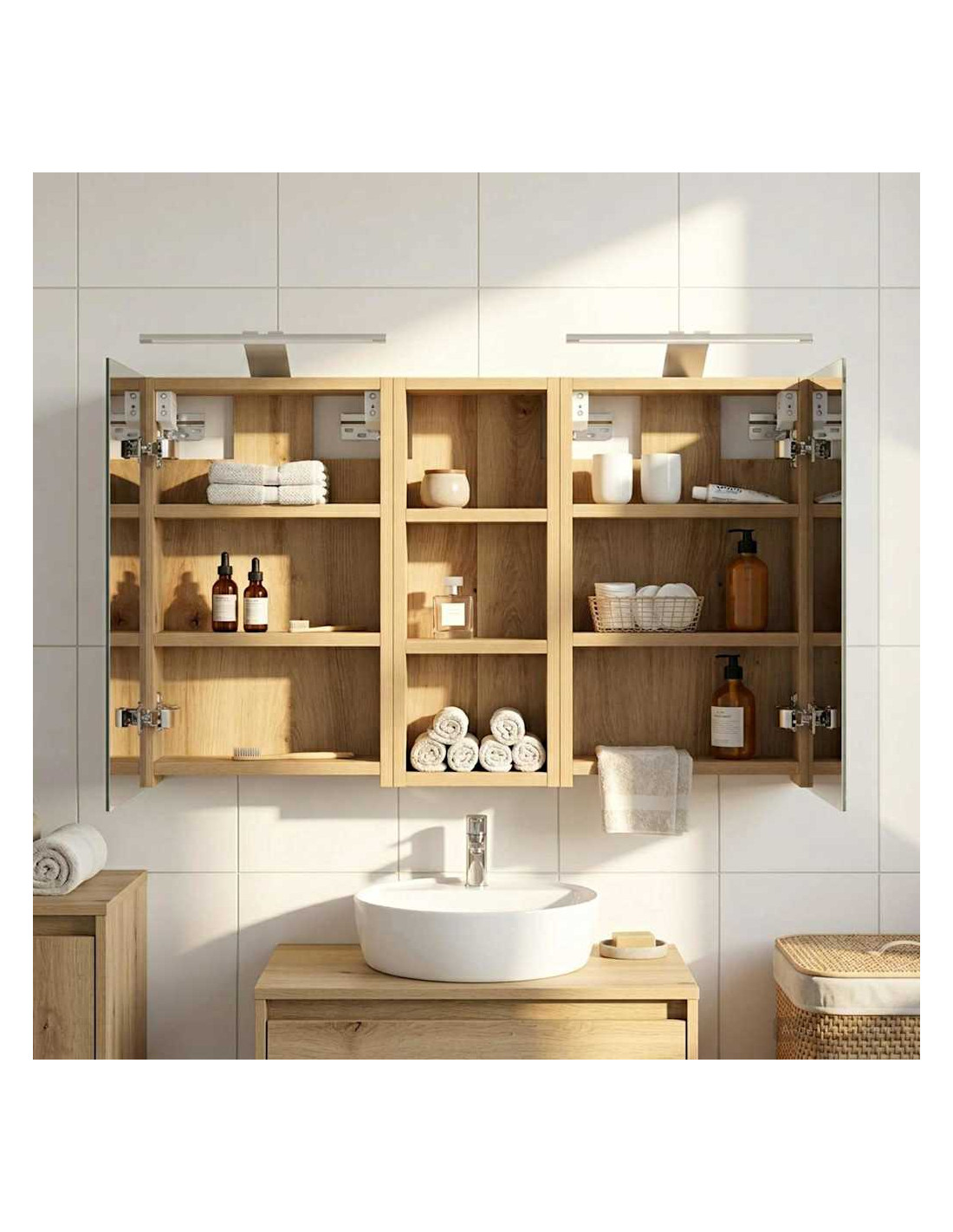 Questo set di armadi moderni per il bagno è il massimo in fatto di stile, combinando un design chic con funzioni pratiche. Creato per chi vive nella modernità, funge sia da spazio di stoccaggio che da decorazione bella, integrandosi perfettamente in ogni bagno. Con tanto spazio grazie alla sua struttura montata a parete, libera il pavimento, rendendo tutto facile da raggiungere. Il set di armadi dà un tocco di freschezza al bagno con lo specchio bifacciale e l'illuminazione LED incorporata, creando un ambiente curato e pronto per l'uso. Costruzione in legno ingegnerizzato Questo set è fatto in legno ingegnerizzato, apprezzato per la sua stabilità e resistenza. Non si deforma né si danneggia facilmente, assicurando un pezzo durevole per l'uso quotidiano. La finitura liscia ne facilita la cura, rendendolo un elemento a bassa manutenzione. Spazio di stoccaggio ampio Progettato per l'utilizzo efficiente, l'armadio da bagno offre tanto spazio con ripiani e porte a cerniera. La disposizione intelligente consente di tenere tutto a portata, garantendo un'organizzazione semplice. Il design salva spazio migliora la funzionalità e riduce il disordine. Specchio bifacciale innovativo Con un specchio bifacciale, questo armadio unisce privacy e visibilità. Il lato esterno è uno specchio standard, mentre quello interno permette una visione discreta, aggiungendo un tocco di classe. Questo elemento arricchisce gli interni moderni grazie alla sua doppia funzione. Illuminazione a striscia LED efficiente Dotato di luci LED USB, illumina gli spazi con una luce bella e a risparmio energetico. Le luci aumentano la visibilità, specialmente di notte, creando un'atmosfera serena e accogliente. Ottimo per chi cerca illuminazione moderna accoppiata a mobili funzionali. Manutenzione e cura semplici Mantenere questo set di armadi è facilissimo. Basta usare un panno morbido e asciutto per le superfici, evitando prodotti chimici aggressivi per preservare il materiale. Queste semplici istruzioni di cura assicurano che l'armadio rimanga un pezzo utile e sempre attuale nel tuo bagno.