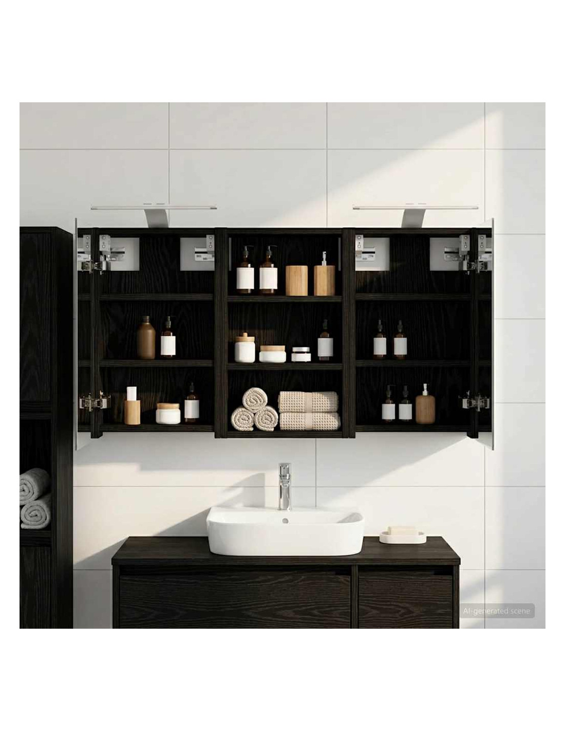 Questo set di armadi moderni per il bagno è il massimo in fatto di stile, combinando un design chic con funzioni pratiche. Creato per chi vive nella modernità, funge sia da spazio di stoccaggio che da decorazione bella, integrandosi perfettamente in ogni bagno. Con tanto spazio grazie alla sua struttura montata a parete, libera il pavimento, rendendo tutto facile da raggiungere. Il set di armadi dà un tocco di freschezza al bagno con lo specchio bifacciale e l'illuminazione LED incorporata, creando un ambiente curato e pronto per l'uso. Costruzione in legno ingegnerizzato Questo set è fatto in legno ingegnerizzato, apprezzato per la sua stabilità e resistenza. Non si deforma né si danneggia facilmente, assicurando un pezzo durevole per l'uso quotidiano. La finitura liscia ne facilita la cura, rendendolo un elemento a bassa manutenzione. Spazio di stoccaggio ampio Progettato per l'utilizzo efficiente, l'armadio da bagno offre tanto spazio con ripiani e porte a cerniera. La disposizione intelligente consente di tenere tutto a portata, garantendo un'organizzazione semplice. Il design salva spazio migliora la funzionalità e riduce il disordine. Specchio bifacciale innovativo Con un specchio bifacciale, questo armadio unisce privacy e visibilità. Il lato esterno è uno specchio standard, mentre quello interno permette una visione discreta, aggiungendo un tocco di classe. Questo elemento arricchisce gli interni moderni grazie alla sua doppia funzione. Illuminazione a striscia LED efficiente Dotato di luci LED USB, illumina gli spazi con una luce bella e a risparmio energetico. Le luci aumentano la visibilità, specialmente di notte, creando un'atmosfera serena e accogliente. Ottimo per chi cerca illuminazione moderna accoppiata a mobili funzionali. Manutenzione e cura semplici Mantenere questo set di armadi è facilissimo. Basta usare un panno morbido e asciutto per le superfici, evitando prodotti chimici aggressivi per preservare il materiale. Queste semplici istruzioni di cura assicurano che l'armadio rimanga un pezzo utile e sempre attuale nel tuo bagno.
