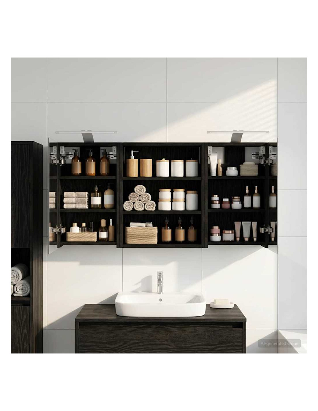 Questo set di armadi moderni per il bagno è il massimo in fatto di stile, combinando un design chic con funzioni pratiche. Creato per chi vive nella modernità, funge sia da spazio di stoccaggio che da decorazione bella, integrandosi perfettamente in ogni bagno. Con tanto spazio grazie alla sua struttura montata a parete, libera il pavimento, rendendo tutto facile da raggiungere. Il set di armadi dà un tocco di freschezza al bagno con lo specchio bifacciale e l'illuminazione LED incorporata, creando un ambiente curato e pronto per l'uso. Costruzione in legno ingegnerizzato Questo set è fatto in legno ingegnerizzato, apprezzato per la sua stabilità e resistenza. Non si deforma né si danneggia facilmente, assicurando un pezzo durevole per l'uso quotidiano. La finitura liscia ne facilita la cura, rendendolo un elemento a bassa manutenzione. Spazio di stoccaggio ampio Progettato per l'utilizzo efficiente, l'armadio da bagno offre tanto spazio con ripiani e porte a cerniera. La disposizione intelligente consente di tenere tutto a portata, garantendo un'organizzazione semplice. Il design salva spazio migliora la funzionalità e riduce il disordine. Specchio bifacciale innovativo Con un specchio bifacciale, questo armadio unisce privacy e visibilità. Il lato esterno è uno specchio standard, mentre quello interno permette una visione discreta, aggiungendo un tocco di classe. Questo elemento arricchisce gli interni moderni grazie alla sua doppia funzione. Illuminazione a striscia LED efficiente Dotato di luci LED USB, illumina gli spazi con una luce bella e a risparmio energetico. Le luci aumentano la visibilità, specialmente di notte, creando un'atmosfera serena e accogliente. Ottimo per chi cerca illuminazione moderna accoppiata a mobili funzionali. Manutenzione e cura semplici Mantenere questo set di armadi è facilissimo. Basta usare un panno morbido e asciutto per le superfici, evitando prodotti chimici aggressivi per preservare il materiale. Queste semplici istruzioni di cura assicurano che l'armadio rimanga un pezzo utile e sempre attuale nel tuo bagno.