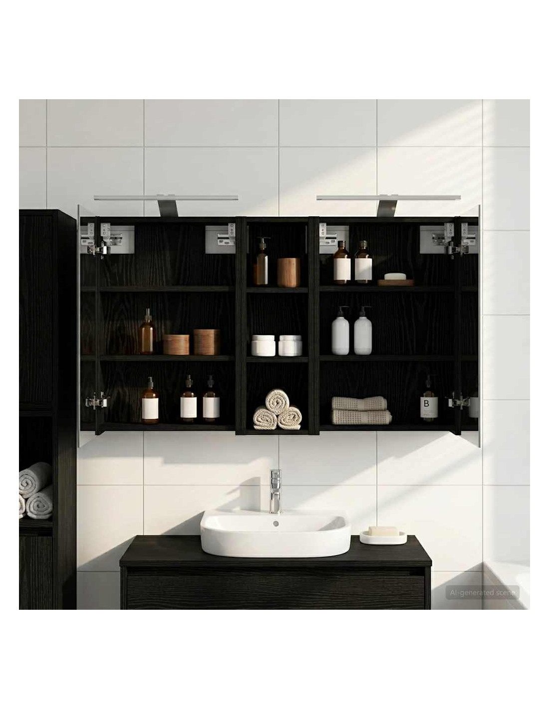 Questo set di armadi moderni per il bagno è il massimo in fatto di stile, combinando un design chic con funzioni pratiche. Creato per chi vive nella modernità, funge sia da spazio di stoccaggio che da decorazione bella, integrandosi perfettamente in ogni bagno. Con tanto spazio grazie alla sua struttura montata a parete, libera il pavimento, rendendo tutto facile da raggiungere. Il set di armadi dà un tocco di freschezza al bagno con lo specchio bifacciale e l'illuminazione LED incorporata, creando un ambiente curato e pronto per l'uso. Costruzione in legno ingegnerizzato Questo set è fatto in legno ingegnerizzato, apprezzato per la sua stabilità e resistenza. Non si deforma né si danneggia facilmente, assicurando un pezzo durevole per l'uso quotidiano. La finitura liscia ne facilita la cura, rendendolo un elemento a bassa manutenzione. Spazio di stoccaggio ampio Progettato per l'utilizzo efficiente, l'armadio da bagno offre tanto spazio con ripiani e porte a cerniera. La disposizione intelligente consente di tenere tutto a portata, garantendo un'organizzazione semplice. Il design salva spazio migliora la funzionalità e riduce il disordine. Specchio bifacciale innovativo Con un specchio bifacciale, questo armadio unisce privacy e visibilità. Il lato esterno è uno specchio standard, mentre quello interno permette una visione discreta, aggiungendo un tocco di classe. Questo elemento arricchisce gli interni moderni grazie alla sua doppia funzione. Illuminazione a striscia LED efficiente Dotato di luci LED USB, illumina gli spazi con una luce bella e a risparmio energetico. Le luci aumentano la visibilità, specialmente di notte, creando un'atmosfera serena e accogliente. Ottimo per chi cerca illuminazione moderna accoppiata a mobili funzionali. Manutenzione e cura semplici Mantenere questo set di armadi è facilissimo. Basta usare un panno morbido e asciutto per le superfici, evitando prodotti chimici aggressivi per preservare il materiale. Queste semplici istruzioni di cura assicurano che l'armadio rimanga un pezzo utile e sempre attuale nel tuo bagno.