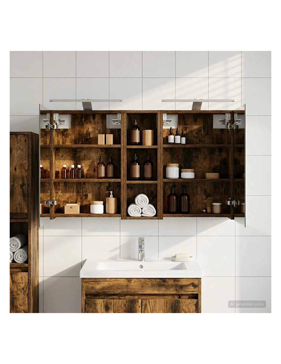 Questo set di armadi moderni per il bagno è il massimo in fatto di stile, combinando un design chic con funzioni pratiche. Creato per chi vive nella modernità, funge sia da spazio di stoccaggio che da decorazione bella, integrandosi perfettamente in ogni bagno. Con tanto spazio grazie alla sua struttura montata a parete, libera il pavimento, rendendo tutto facile da raggiungere. Il set di armadi dà un tocco di freschezza al bagno con lo specchio bifacciale e l'illuminazione LED incorporata, creando un ambiente curato e pronto per l'uso. Costruzione in legno ingegnerizzato Questo set è fatto in legno ingegnerizzato, apprezzato per la sua stabilità e resistenza. Non si deforma né si danneggia facilmente, assicurando un pezzo durevole per l'uso quotidiano. La finitura liscia ne facilita la cura, rendendolo un elemento a bassa manutenzione. Spazio di stoccaggio ampio Progettato per l'utilizzo efficiente, l'armadio da bagno offre tanto spazio con ripiani e porte a cerniera. La disposizione intelligente consente di tenere tutto a portata, garantendo un'organizzazione semplice. Il design salva spazio migliora la funzionalità e riduce il disordine. Specchio bifacciale innovativo Con un specchio bifacciale, questo armadio unisce privacy e visibilità. Il lato esterno è uno specchio standard, mentre quello interno permette una visione discreta, aggiungendo un tocco di classe. Questo elemento arricchisce gli interni moderni grazie alla sua doppia funzione. Illuminazione a striscia LED efficiente Dotato di luci LED USB, illumina gli spazi con una luce bella e a risparmio energetico. Le luci aumentano la visibilità, specialmente di notte, creando un'atmosfera serena e accogliente. Ottimo per chi cerca illuminazione moderna accoppiata a mobili funzionali. Manutenzione e cura semplici Mantenere questo set di armadi è facilissimo. Basta usare un panno morbido e asciutto per le superfici, evitando prodotti chimici aggressivi per preservare il materiale. Queste semplici istruzioni di cura assicurano che l'armadio rimanga un pezzo utile e sempre attuale nel tuo bagno.