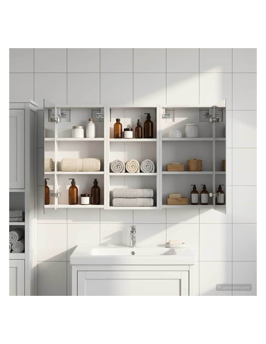 Questo set di armadi moderni per il bagno è il massimo in fatto di stile, combinando un design chic con funzioni pratiche. Creato per chi vive nella modernità, funge sia da spazio di stoccaggio che da decorazione bella, integrandosi perfettamente in ogni bagno. Con tanto spazio grazie alla sua struttura montata a parete, libera il pavimento, rendendo tutto facile da raggiungere. Il set di armadi dà un tocco di freschezza al bagno con lo specchio bifacciale e l'illuminazione LED incorporata, creando un ambiente curato e pronto per l'uso. Costruzione in legno ingegnerizzato Questo set è fatto in legno ingegnerizzato, apprezzato per la sua stabilità e resistenza. Non si deforma né si danneggia facilmente, assicurando un pezzo durevole per l'uso quotidiano. La finitura liscia ne facilita la cura, rendendolo un elemento a bassa manutenzione. Spazio di stoccaggio ampio Progettato per l'utilizzo efficiente, l'armadio da bagno offre tanto spazio con ripiani e porte a cerniera. La disposizione intelligente consente di tenere tutto a portata, garantendo un'organizzazione semplice. Il design salva spazio migliora la funzionalità e riduce il disordine. Specchio bifacciale innovativo Con un specchio bifacciale, questo armadio unisce privacy e visibilità. Il lato esterno è uno specchio standard, mentre quello interno permette una visione discreta, aggiungendo un tocco di classe. Questo elemento arricchisce gli interni moderni grazie alla sua doppia funzione. Illuminazione a striscia LED efficiente Dotato di luci LED USB, illumina gli spazi con una luce bella e a risparmio energetico. Le luci aumentano la visibilità, specialmente di notte, creando un'atmosfera serena e accogliente. Ottimo per chi cerca illuminazione moderna accoppiata a mobili funzionali. Manutenzione e cura semplici Mantenere questo set di armadi è facilissimo. Basta usare un panno morbido e asciutto per le superfici, evitando prodotti chimici aggressivi per preservare il materiale. Queste semplici istruzioni di cura assicurano che l'armadio rimanga un pezzo utile e sempre attuale nel tuo bagno.