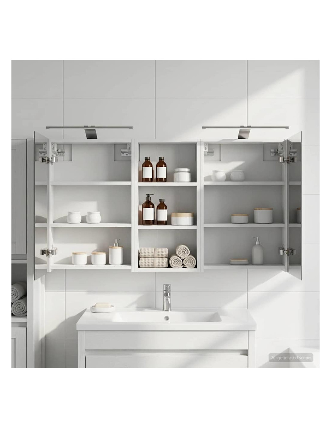 Questo set di armadi moderni per il bagno è il massimo in fatto di stile, combinando un design chic con funzioni pratiche. Creato per chi vive nella modernità, funge sia da spazio di stoccaggio che da decorazione bella, integrandosi perfettamente in ogni bagno. Con tanto spazio grazie alla sua struttura montata a parete, libera il pavimento, rendendo tutto facile da raggiungere. Il set di armadi dà un tocco di freschezza al bagno con lo specchio bifacciale e l'illuminazione LED incorporata, creando un ambiente curato e pronto per l'uso. Costruzione in legno ingegnerizzato Questo set è fatto in legno ingegnerizzato, apprezzato per la sua stabilità e resistenza. Non si deforma né si danneggia facilmente, assicurando un pezzo durevole per l'uso quotidiano. La finitura liscia ne facilita la cura, rendendolo un elemento a bassa manutenzione. Spazio di stoccaggio ampio Progettato per l'utilizzo efficiente, l'armadio da bagno offre tanto spazio con ripiani e porte a cerniera. La disposizione intelligente consente di tenere tutto a portata, garantendo un'organizzazione semplice. Il design salva spazio migliora la funzionalità e riduce il disordine. Specchio bifacciale innovativo Con un specchio bifacciale, questo armadio unisce privacy e visibilità. Il lato esterno è uno specchio standard, mentre quello interno permette una visione discreta, aggiungendo un tocco di classe. Questo elemento arricchisce gli interni moderni grazie alla sua doppia funzione. Illuminazione a striscia LED efficiente Dotato di luci LED USB, illumina gli spazi con una luce bella e a risparmio energetico. Le luci aumentano la visibilità, specialmente di notte, creando un'atmosfera serena e accogliente. Ottimo per chi cerca illuminazione moderna accoppiata a mobili funzionali. Manutenzione e cura semplici Mantenere questo set di armadi è facilissimo. Basta usare un panno morbido e asciutto per le superfici, evitando prodotti chimici aggressivi per preservare il materiale. Queste semplici istruzioni di cura assicurano che l'armadio rimanga un pezzo utile e sempre attuale nel tuo bagno.