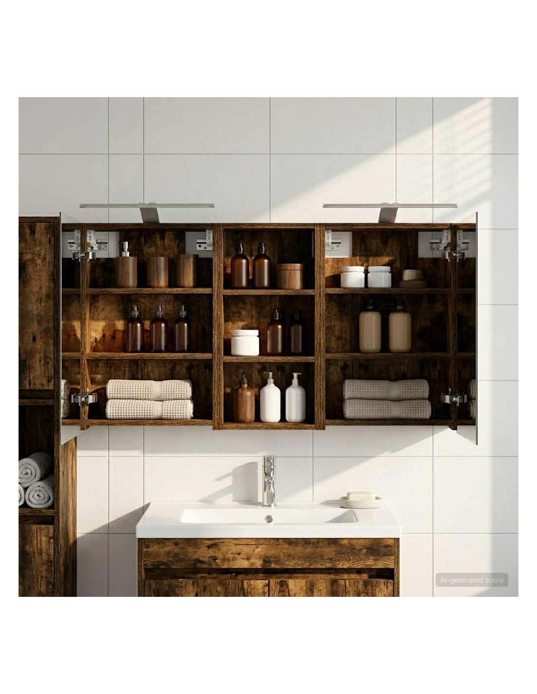 Questo set di armadi moderni per il bagno è il massimo in fatto di stile, combinando un design chic con funzioni pratiche. Creato per chi vive nella modernità, funge sia da spazio di stoccaggio che da decorazione bella, integrandosi perfettamente in ogni bagno. Con tanto spazio grazie alla sua struttura montata a parete, libera il pavimento, rendendo tutto facile da raggiungere. Il set di armadi dà un tocco di freschezza al bagno con lo specchio bifacciale e l'illuminazione LED incorporata, creando un ambiente curato e pronto per l'uso. Costruzione in legno ingegnerizzato Questo set è fatto in legno ingegnerizzato, apprezzato per la sua stabilità e resistenza. Non si deforma né si danneggia facilmente, assicurando un pezzo durevole per l'uso quotidiano. La finitura liscia ne facilita la cura, rendendolo un elemento a bassa manutenzione. Spazio di stoccaggio ampio Progettato per l'utilizzo efficiente, l'armadio da bagno offre tanto spazio con ripiani e porte a cerniera. La disposizione intelligente consente di tenere tutto a portata, garantendo un'organizzazione semplice. Il design salva spazio migliora la funzionalità e riduce il disordine. Specchio bifacciale innovativo Con un specchio bifacciale, questo armadio unisce privacy e visibilità. Il lato esterno è uno specchio standard, mentre quello interno permette una visione discreta, aggiungendo un tocco di classe. Questo elemento arricchisce gli interni moderni grazie alla sua doppia funzione. Illuminazione a striscia LED efficiente Dotato di luci LED USB, illumina gli spazi con una luce bella e a risparmio energetico. Le luci aumentano la visibilità, specialmente di notte, creando un'atmosfera serena e accogliente. Ottimo per chi cerca illuminazione moderna accoppiata a mobili funzionali. Manutenzione e cura semplici Mantenere questo set di armadi è facilissimo. Basta usare un panno morbido e asciutto per le superfici, evitando prodotti chimici aggressivi per preservare il materiale. Queste semplici istruzioni di cura assicurano che l'armadio rimanga un pezzo utile e sempre attuale nel tuo bagno.