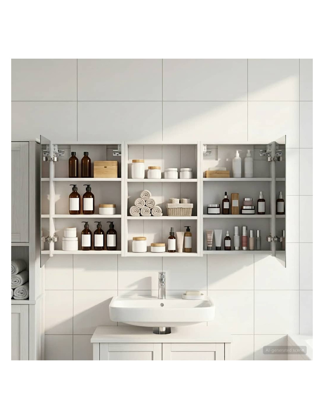 Questo set di armadi moderni per il bagno è il massimo in fatto di stile, combinando un design chic con funzioni pratiche. Creato per chi vive nella modernità, funge sia da spazio di stoccaggio che da decorazione bella, integrandosi perfettamente in ogni bagno. Con tanto spazio grazie alla sua struttura montata a parete, libera il pavimento, rendendo tutto facile da raggiungere. Il set di armadi dà un tocco di freschezza al bagno con lo specchio bifacciale e l'illuminazione LED incorporata, creando un ambiente curato e pronto per l'uso. Costruzione in legno ingegnerizzato Questo set è fatto in legno ingegnerizzato, apprezzato per la sua stabilità e resistenza. Non si deforma né si danneggia facilmente, assicurando un pezzo durevole per l'uso quotidiano. La finitura liscia ne facilita la cura, rendendolo un elemento a bassa manutenzione. Spazio di stoccaggio ampio Progettato per l'utilizzo efficiente, l'armadio da bagno offre tanto spazio con ripiani e porte a cerniera. La disposizione intelligente consente di tenere tutto a portata, garantendo un'organizzazione semplice. Il design salva spazio migliora la funzionalità e riduce il disordine. Specchio bifacciale innovativo Con un specchio bifacciale, questo armadio unisce privacy e visibilità. Il lato esterno è uno specchio standard, mentre quello interno permette una visione discreta, aggiungendo un tocco di classe. Questo elemento arricchisce gli interni moderni grazie alla sua doppia funzione. Illuminazione a striscia LED efficiente Dotato di luci LED USB, illumina gli spazi con una luce bella e a risparmio energetico. Le luci aumentano la visibilità, specialmente di notte, creando un'atmosfera serena e accogliente. Ottimo per chi cerca illuminazione moderna accoppiata a mobili funzionali. Manutenzione e cura semplici Mantenere questo set di armadi è facilissimo. Basta usare un panno morbido e asciutto per le superfici, evitando prodotti chimici aggressivi per preservare il materiale. Queste semplici istruzioni di cura assicurano che l'armadio rimanga un pezzo utile e sempre attuale nel tuo bagno.