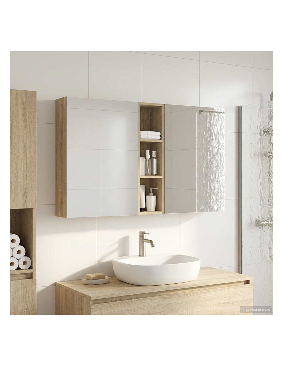 Questo set di armadi moderni per il bagno è il massimo in fatto di stile, combinando un design chic con funzioni pratiche. Creato per chi vive nella modernità, funge sia da spazio di stoccaggio che da decorazione bella, integrandosi perfettamente in ogni bagno. Con tanto spazio grazie alla sua struttura montata a parete, libera il pavimento, rendendo tutto facile da raggiungere. Il set di armadi dà un tocco di freschezza al bagno con lo specchio bifacciale e l'illuminazione LED incorporata, creando un ambiente curato e pronto per l'uso. Costruzione in legno ingegnerizzato Questo set è fatto in legno ingegnerizzato, apprezzato per la sua stabilità e resistenza. Non si deforma né si danneggia facilmente, assicurando un pezzo durevole per l'uso quotidiano. La finitura liscia ne facilita la cura, rendendolo un elemento a bassa manutenzione. Spazio di stoccaggio ampio Progettato per l'utilizzo efficiente, l'armadio da bagno offre tanto spazio con ripiani e porte a cerniera. La disposizione intelligente consente di tenere tutto a portata, garantendo un'organizzazione semplice. Il design salva spazio migliora la funzionalità e riduce il disordine. Specchio bifacciale innovativo Con un specchio bifacciale, questo armadio unisce privacy e visibilità. Il lato esterno è uno specchio standard, mentre quello interno permette una visione discreta, aggiungendo un tocco di classe. Questo elemento arricchisce gli interni moderni grazie alla sua doppia funzione. Illuminazione a striscia LED efficiente Dotato di luci LED USB, illumina gli spazi con una luce bella e a risparmio energetico. Le luci aumentano la visibilità, specialmente di notte, creando un'atmosfera serena e accogliente. Ottimo per chi cerca illuminazione moderna accoppiata a mobili funzionali. Manutenzione e cura semplici Mantenere questo set di armadi è facilissimo. Basta usare un panno morbido e asciutto per le superfici, evitando prodotti chimici aggressivi per preservare il materiale. Queste semplici istruzioni di cura assicurano che l'armadio rimanga un pezzo utile e sempre attuale nel tuo bagno.