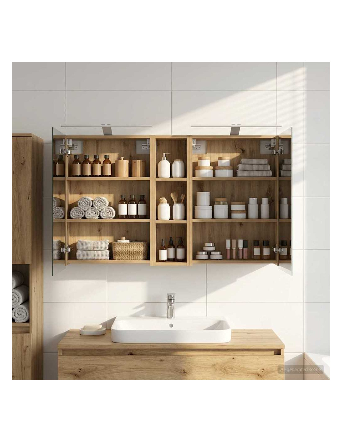 Questo set di armadi moderni per il bagno è il massimo in fatto di stile, combinando un design chic con funzioni pratiche. Creato per chi vive nella modernità, funge sia da spazio di stoccaggio che da decorazione bella, integrandosi perfettamente in ogni bagno. Con tanto spazio grazie alla sua struttura montata a parete, libera il pavimento, rendendo tutto facile da raggiungere. Il set di armadi dà un tocco di freschezza al bagno con lo specchio bifacciale e l'illuminazione LED incorporata, creando un ambiente curato e pronto per l'uso. Costruzione in legno ingegnerizzato Questo set è fatto in legno ingegnerizzato, apprezzato per la sua stabilità e resistenza. Non si deforma né si danneggia facilmente, assicurando un pezzo durevole per l'uso quotidiano. La finitura liscia ne facilita la cura, rendendolo un elemento a bassa manutenzione. Spazio di stoccaggio ampio Progettato per l'utilizzo efficiente, l'armadio da bagno offre tanto spazio con ripiani e porte a cerniera. La disposizione intelligente consente di tenere tutto a portata, garantendo un'organizzazione semplice. Il design salva spazio migliora la funzionalità e riduce il disordine. Specchio bifacciale innovativo Con un specchio bifacciale, questo armadio unisce privacy e visibilità. Il lato esterno è uno specchio standard, mentre quello interno permette una visione discreta, aggiungendo un tocco di classe. Questo elemento arricchisce gli interni moderni grazie alla sua doppia funzione. Illuminazione a striscia LED efficiente Dotato di luci LED USB, illumina gli spazi con una luce bella e a risparmio energetico. Le luci aumentano la visibilità, specialmente di notte, creando un'atmosfera serena e accogliente. Ottimo per chi cerca illuminazione moderna accoppiata a mobili funzionali. Manutenzione e cura semplici Mantenere questo set di armadi è facilissimo. Basta usare un panno morbido e asciutto per le superfici, evitando prodotti chimici aggressivi per preservare il materiale. Queste semplici istruzioni di cura assicurano che l'armadio rimanga un pezzo utile e sempre attuale nel tuo bagno.