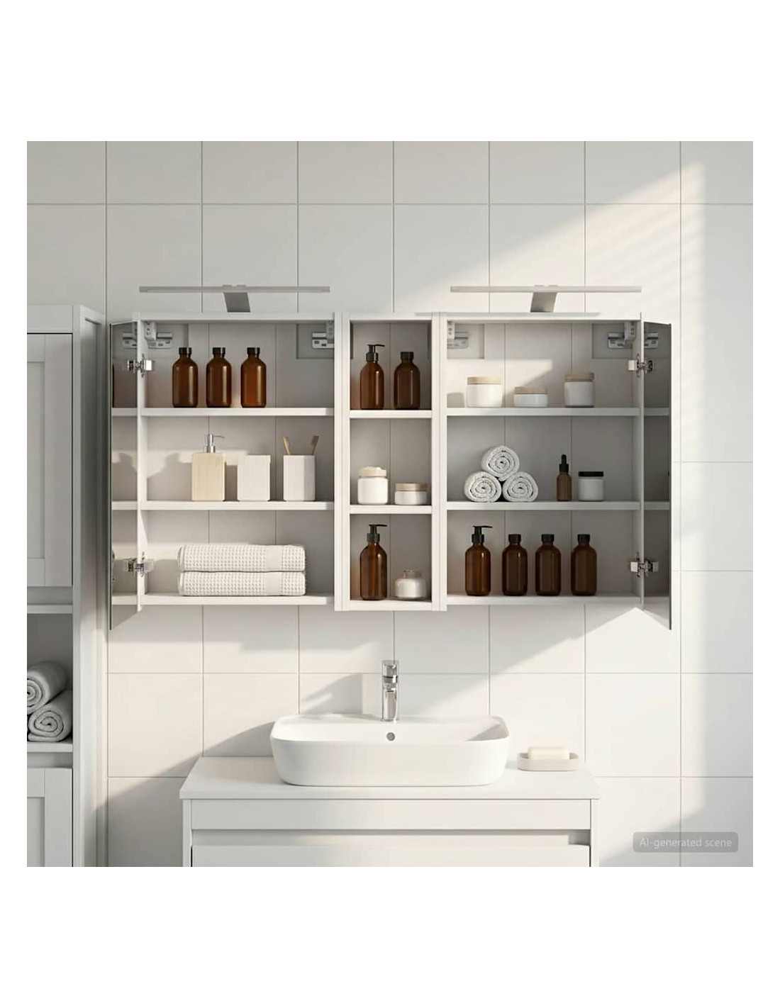 Questo Set di Armadi per Bagno è la soluzione perfetta per un bagno moderno, unendo design elegante e funzionalità. Realizzato in legno ingegnerizzato, l'armadio ha uno specchio bidirezionale che amplifica visivamente lo spazio e aggiunge un tocco di interesse. È ideale per proprietari di casa e designer, offrendo stoccaggio efficiente e migliorando l'estetica con il suo design minimalista e l'illuminazione a LED, rendendolo il perfetto mix di forma e funzione. Costruzione in Legno Ingegnerizzato: L'armadio è fatto in legno ingegnerizzato, robusto e durevole, che mantiene un aspetto impeccabile anche in condizioni di umidità. Facile da pulire e resistente all'usura. Ante a Doppia Funzione: Le porte in vetro a cerniera offrono un'apertura fluida e un design elegante. All'interno troverai scomparti spaziosi per articoli da bagno, aiutandoti a restare organizzato. Illuminazione Innovativa: Con strisce LED alimentate tramite USB, questo armadio offre un'illuminazione ideale per la cura personale, aggiungendo anche un tocco estetico alla stanza. Specchio Bidirezionale: Lo specchio unico aggiunge profondità e stile all'armadio, ideale per privacy e per riflessioni durante il trucco o la rasatura. Montaggio a Muro Facile: Questo armadio può essere facilmente montato sulle pareti, liberando spazio prezioso e garantendo un aspetto ordinato e organizzato.