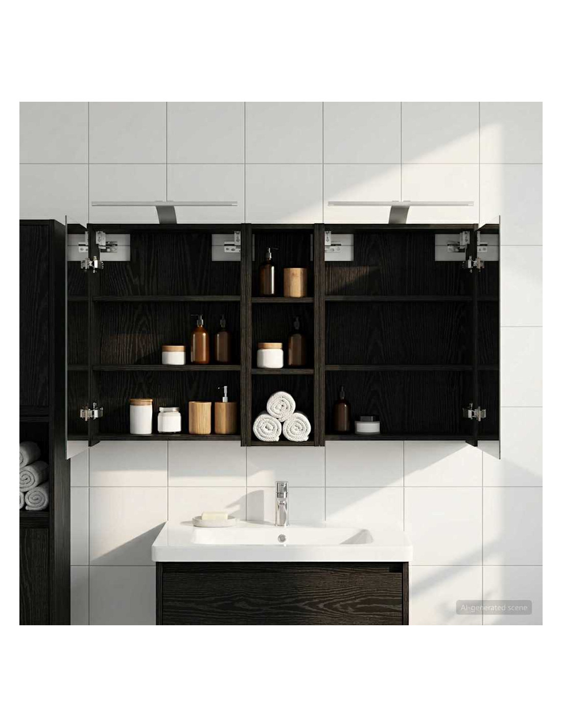Questo Set di Armadi per Bagno è la soluzione perfetta per un bagno moderno, unendo design elegante e funzionalità. Realizzato in legno ingegnerizzato, l'armadio ha uno specchio bidirezionale che amplifica visivamente lo spazio e aggiunge un tocco di interesse. È ideale per proprietari di casa e designer, offrendo stoccaggio efficiente e migliorando l'estetica con il suo design minimalista e l'illuminazione a LED, rendendolo il perfetto mix di forma e funzione. Costruzione in Legno Ingegnerizzato: L'armadio è fatto in legno ingegnerizzato, robusto e durevole, che mantiene un aspetto impeccabile anche in condizioni di umidità. Facile da pulire e resistente all'usura. Ante a Doppia Funzione: Le porte in vetro a cerniera offrono un'apertura fluida e un design elegante. All'interno troverai scomparti spaziosi per articoli da bagno, aiutandoti a restare organizzato. Illuminazione Innovativa: Con strisce LED alimentate tramite USB, questo armadio offre un'illuminazione ideale per la cura personale, aggiungendo anche un tocco estetico alla stanza. Specchio Bidirezionale: Lo specchio unico aggiunge profondità e stile all'armadio, ideale per privacy e per riflessioni durante il trucco o la rasatura. Montaggio a Muro Facile: Questo armadio può essere facilmente montato sulle pareti, liberando spazio prezioso e garantendo un aspetto ordinato e organizzato.