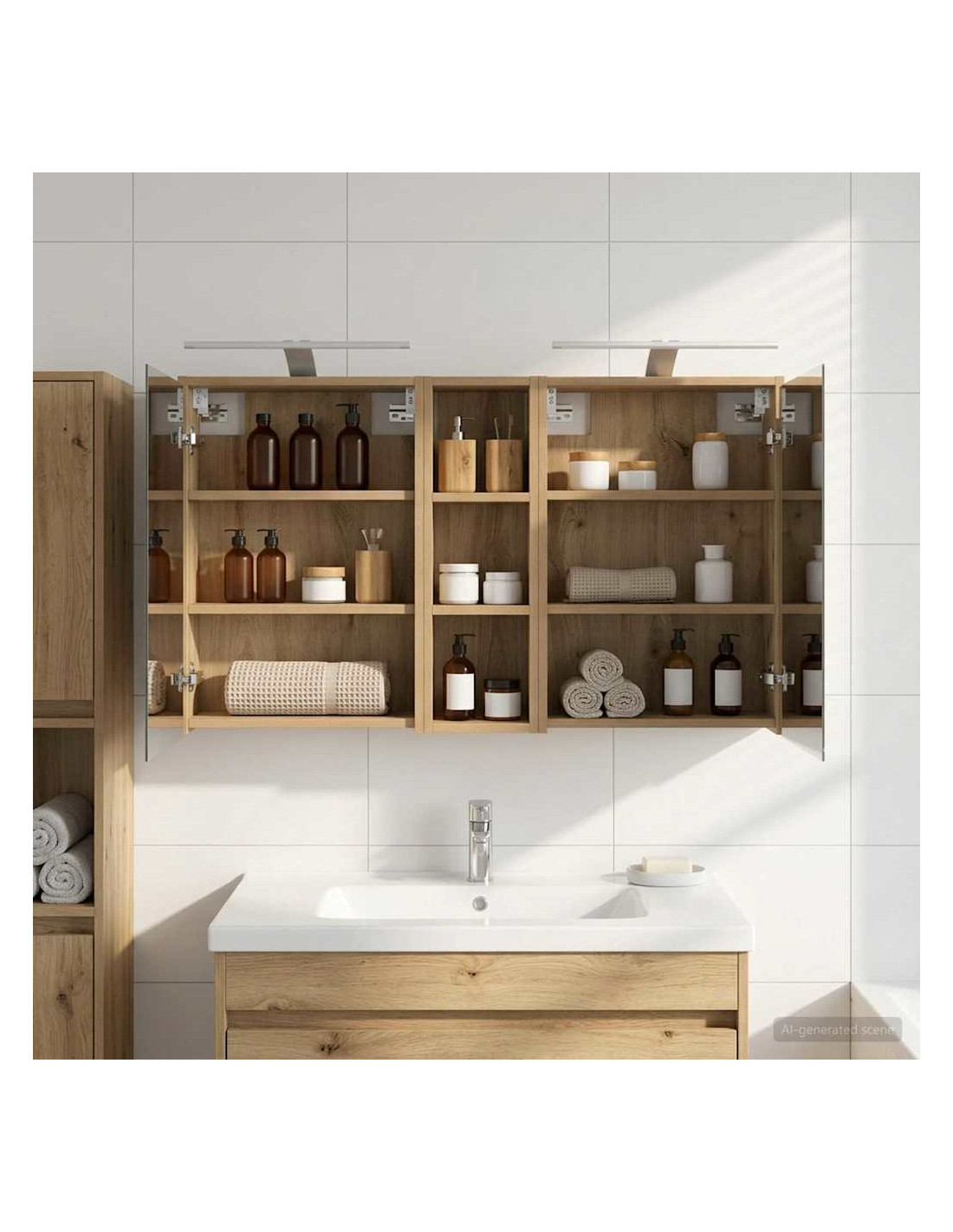 Questo Set di Armadi per Bagno è la soluzione perfetta per un bagno moderno, unendo design elegante e funzionalità. Realizzato in legno ingegnerizzato, l'armadio ha uno specchio bidirezionale che amplifica visivamente lo spazio e aggiunge un tocco di interesse. È ideale per proprietari di casa e designer, offrendo stoccaggio efficiente e migliorando l'estetica con il suo design minimalista e l'illuminazione a LED, rendendolo il perfetto mix di forma e funzione. Costruzione in Legno Ingegnerizzato: L'armadio è fatto in legno ingegnerizzato, robusto e durevole, che mantiene un aspetto impeccabile anche in condizioni di umidità. Facile da pulire e resistente all'usura. Ante a Doppia Funzione: Le porte in vetro a cerniera offrono un'apertura fluida e un design elegante. All'interno troverai scomparti spaziosi per articoli da bagno, aiutandoti a restare organizzato. Illuminazione Innovativa: Con strisce LED alimentate tramite USB, questo armadio offre un'illuminazione ideale per la cura personale, aggiungendo anche un tocco estetico alla stanza. Specchio Bidirezionale: Lo specchio unico aggiunge profondità e stile all'armadio, ideale per privacy e per riflessioni durante il trucco o la rasatura. Montaggio a Muro Facile: Questo armadio può essere facilmente montato sulle pareti, liberando spazio prezioso e garantendo un aspetto ordinato e organizzato.