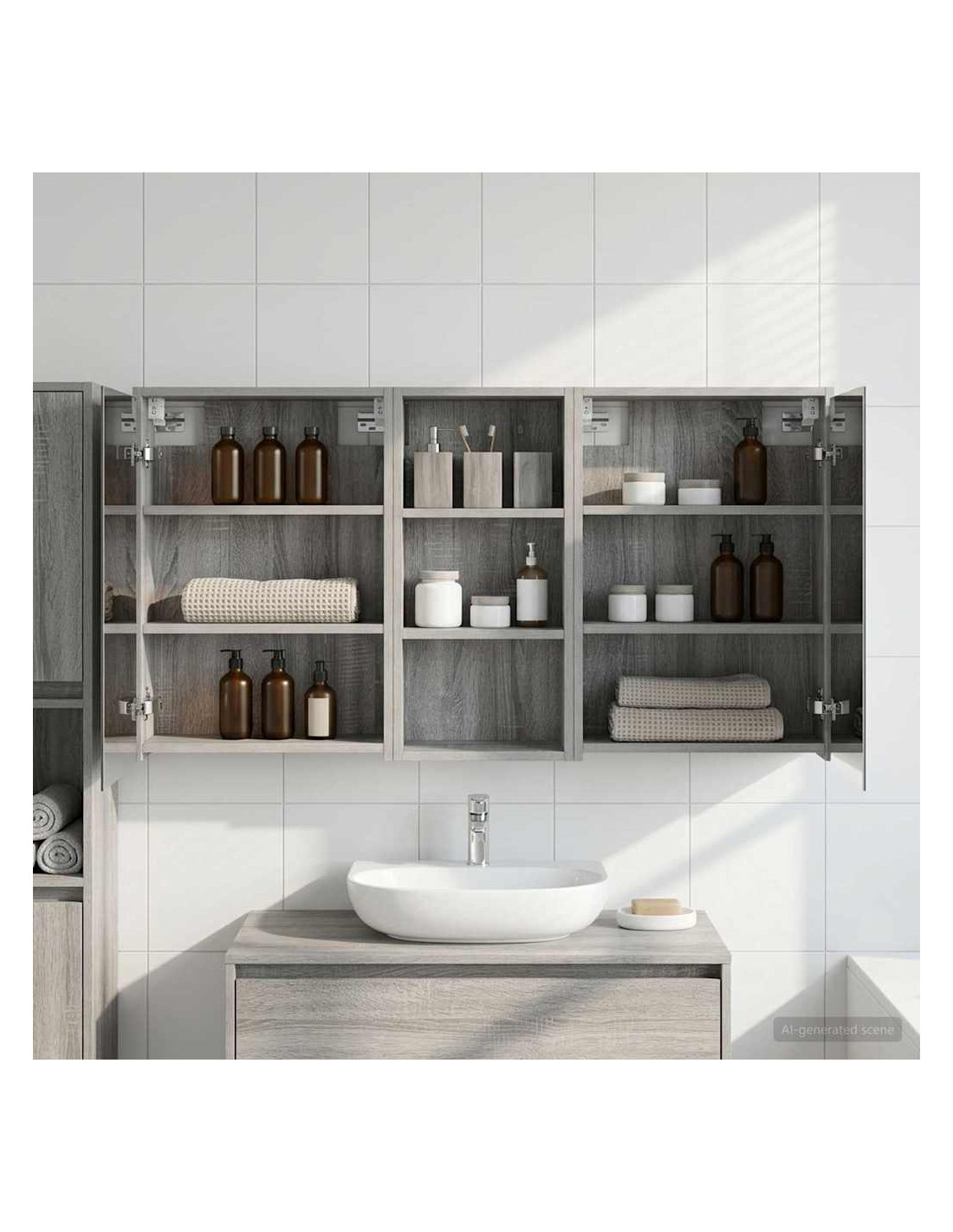 Questo Set di Armadi per Bagno è la soluzione perfetta per un bagno moderno, unendo design elegante e funzionalità. Realizzato in legno ingegnerizzato, l'armadio ha uno specchio bidirezionale che amplifica visivamente lo spazio e aggiunge un tocco di interesse. È ideale per proprietari di casa e designer, offrendo stoccaggio efficiente e migliorando l'estetica con il suo design minimalista e l'illuminazione a LED, rendendolo il perfetto mix di forma e funzione. Costruzione in Legno Ingegnerizzato: L'armadio è fatto in legno ingegnerizzato, robusto e durevole, che mantiene un aspetto impeccabile anche in condizioni di umidità. Facile da pulire e resistente all'usura. Ante a Doppia Funzione: Le porte in vetro a cerniera offrono un'apertura fluida e un design elegante. All'interno troverai scomparti spaziosi per articoli da bagno, aiutandoti a restare organizzato. Illuminazione Innovativa: Con strisce LED alimentate tramite USB, questo armadio offre un'illuminazione ideale per la cura personale, aggiungendo anche un tocco estetico alla stanza. Specchio Bidirezionale: Lo specchio unico aggiunge profondità e stile all'armadio, ideale per privacy e per riflessioni durante il trucco o la rasatura. Montaggio a Muro Facile: Questo armadio può essere facilmente montato sulle pareti, liberando spazio prezioso e garantendo un aspetto ordinato e organizzato.