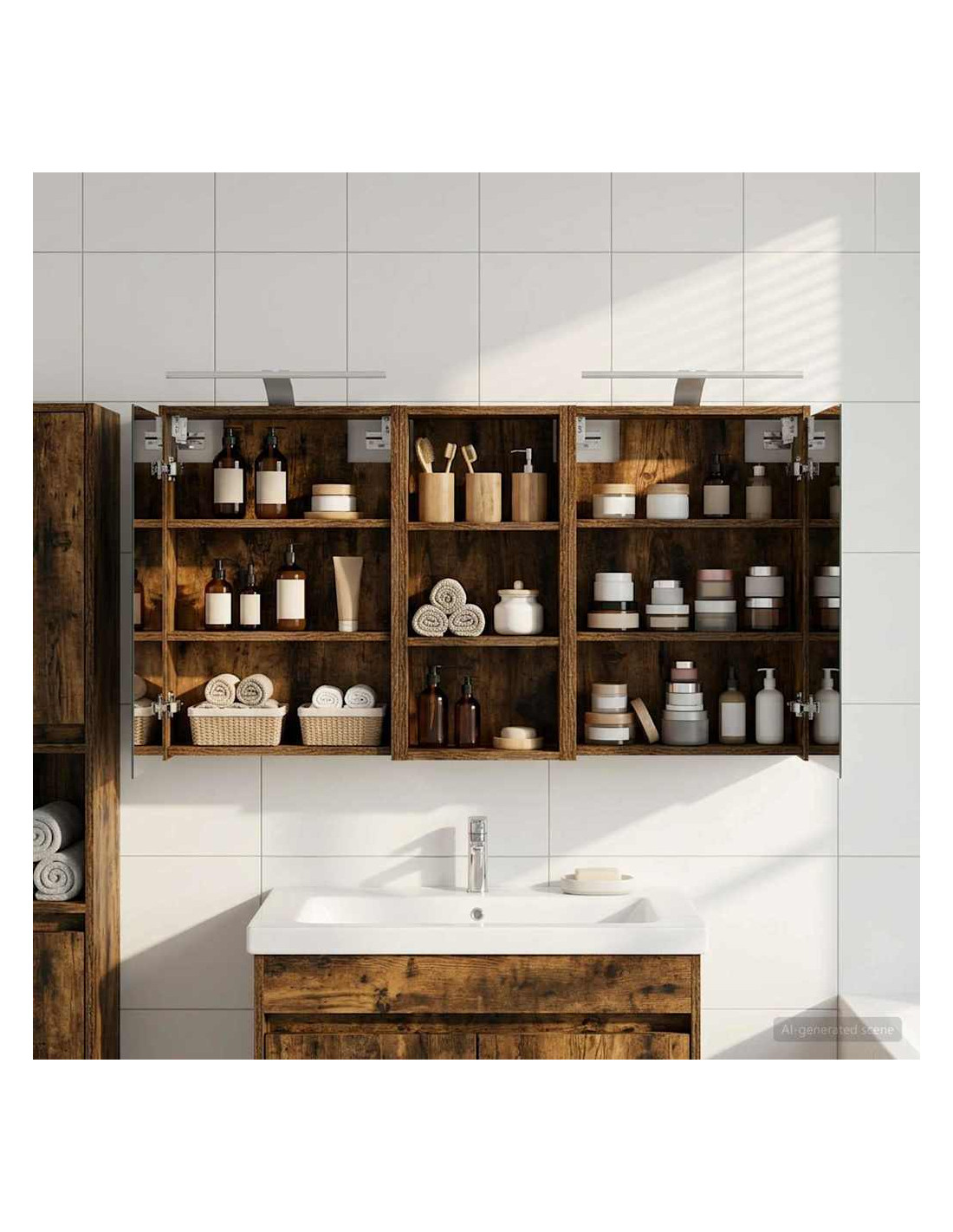 Questo Set di Armadi per Bagno è la soluzione perfetta per un bagno moderno, unendo design elegante e funzionalità. Realizzato in legno ingegnerizzato, l'armadio ha uno specchio bidirezionale che amplifica visivamente lo spazio e aggiunge un tocco di interesse. È ideale per proprietari di casa e designer, offrendo stoccaggio efficiente e migliorando l'estetica con il suo design minimalista e l'illuminazione a LED, rendendolo il perfetto mix di forma e funzione. Costruzione in Legno Ingegnerizzato: L'armadio è fatto in legno ingegnerizzato, robusto e durevole, che mantiene un aspetto impeccabile anche in condizioni di umidità. Facile da pulire e resistente all'usura. Ante a Doppia Funzione: Le porte in vetro a cerniera offrono un'apertura fluida e un design elegante. All'interno troverai scomparti spaziosi per articoli da bagno, aiutandoti a restare organizzato. Illuminazione Innovativa: Con strisce LED alimentate tramite USB, questo armadio offre un'illuminazione ideale per la cura personale, aggiungendo anche un tocco estetico alla stanza. Specchio Bidirezionale: Lo specchio unico aggiunge profondità e stile all'armadio, ideale per privacy e per riflessioni durante il trucco o la rasatura. Montaggio a Muro Facile: Questo armadio può essere facilmente montato sulle pareti, liberando spazio prezioso e garantendo un aspetto ordinato e organizzato.
