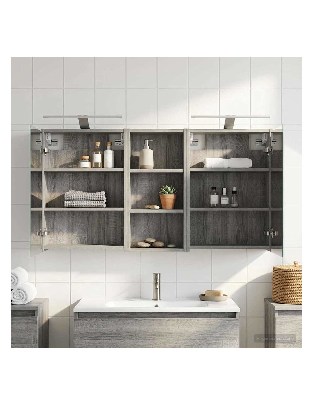 Questo Set di Armadi per Bagno è la soluzione perfetta per un bagno moderno, unendo design elegante e funzionalità. Realizzato in legno ingegnerizzato, l'armadio ha uno specchio bidirezionale che amplifica visivamente lo spazio e aggiunge un tocco di interesse. È ideale per proprietari di casa e designer, offrendo stoccaggio efficiente e migliorando l'estetica con il suo design minimalista e l'illuminazione a LED, rendendolo il perfetto mix di forma e funzione. Costruzione in Legno Ingegnerizzato: L'armadio è fatto in legno ingegnerizzato, robusto e durevole, che mantiene un aspetto impeccabile anche in condizioni di umidità. Facile da pulire e resistente all'usura. Ante a Doppia Funzione: Le porte in vetro a cerniera offrono un'apertura fluida e un design elegante. All'interno troverai scomparti spaziosi per articoli da bagno, aiutandoti a restare organizzato. Illuminazione Innovativa: Con strisce LED alimentate tramite USB, questo armadio offre un'illuminazione ideale per la cura personale, aggiungendo anche un tocco estetico alla stanza. Specchio Bidirezionale: Lo specchio unico aggiunge profondità e stile all'armadio, ideale per privacy e per riflessioni durante il trucco o la rasatura. Montaggio a Muro Facile: Questo armadio può essere facilmente montato sulle pareti, liberando spazio prezioso e garantendo un aspetto ordinato e organizzato.