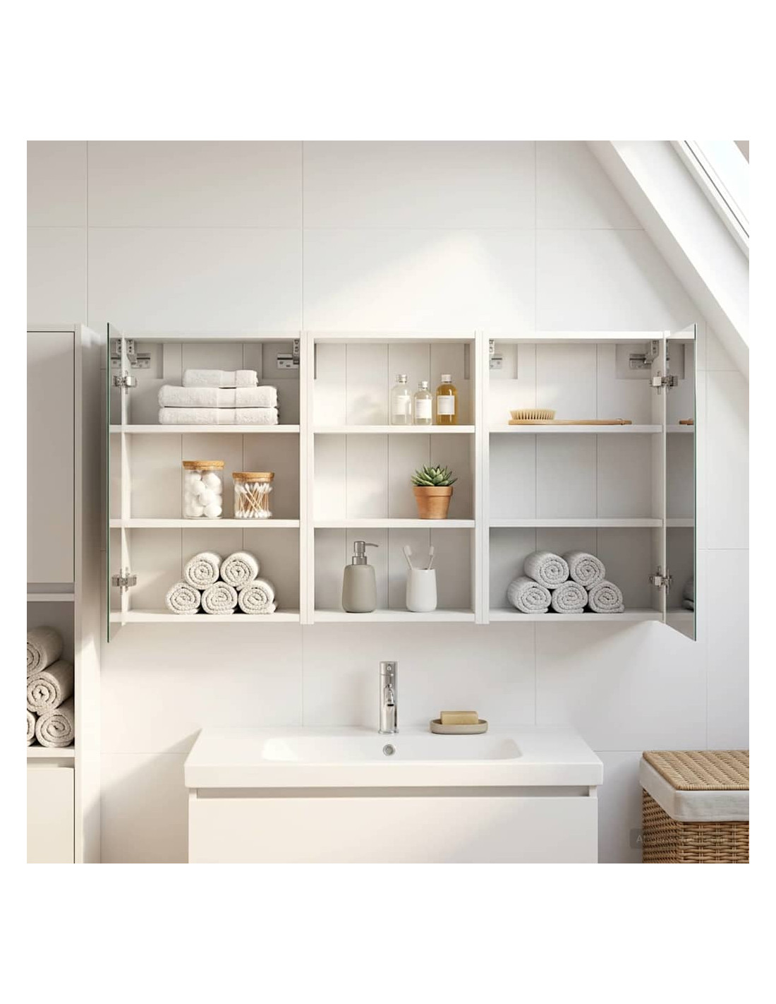 Questo Set di Armadi per Bagno è la soluzione perfetta per un bagno moderno, unendo design elegante e funzionalità. Realizzato in legno ingegnerizzato, l'armadio ha uno specchio bidirezionale che amplifica visivamente lo spazio e aggiunge un tocco di interesse. È ideale per proprietari di casa e designer, offrendo stoccaggio efficiente e migliorando l'estetica con il suo design minimalista e l'illuminazione a LED, rendendolo il perfetto mix di forma e funzione. Costruzione in Legno Ingegnerizzato: L'armadio è fatto in legno ingegnerizzato, robusto e durevole, che mantiene un aspetto impeccabile anche in condizioni di umidità. Facile da pulire e resistente all'usura. Ante a Doppia Funzione: Le porte in vetro a cerniera offrono un'apertura fluida e un design elegante. All'interno troverai scomparti spaziosi per articoli da bagno, aiutandoti a restare organizzato. Illuminazione Innovativa: Con strisce LED alimentate tramite USB, questo armadio offre un'illuminazione ideale per la cura personale, aggiungendo anche un tocco estetico alla stanza. Specchio Bidirezionale: Lo specchio unico aggiunge profondità e stile all'armadio, ideale per privacy e per riflessioni durante il trucco o la rasatura. Montaggio a Muro Facile: Questo armadio può essere facilmente montato sulle pareti, liberando spazio prezioso e garantendo un aspetto ordinato e organizzato.