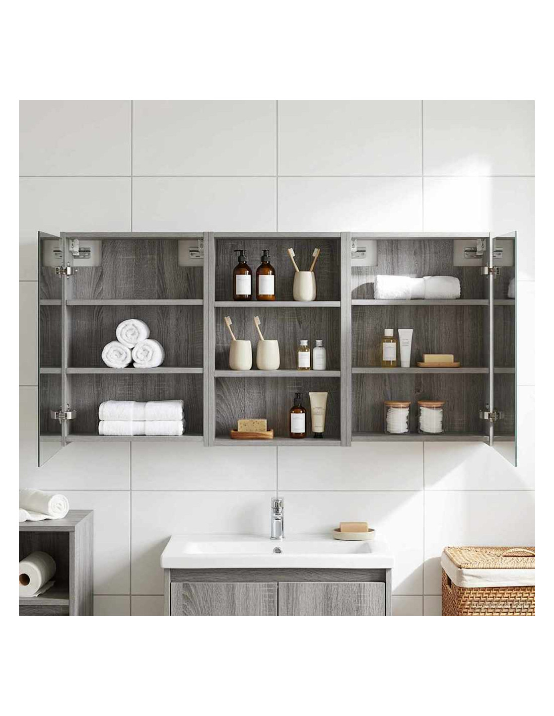 Questo Set di Armadi per Bagno è la soluzione perfetta per un bagno moderno, unendo design elegante e funzionalità. Realizzato in legno ingegnerizzato, l'armadio ha uno specchio bidirezionale che amplifica visivamente lo spazio e aggiunge un tocco di interesse. È ideale per proprietari di casa e designer, offrendo stoccaggio efficiente e migliorando l'estetica con il suo design minimalista e l'illuminazione a LED, rendendolo il perfetto mix di forma e funzione. Costruzione in Legno Ingegnerizzato: L'armadio è fatto in legno ingegnerizzato, robusto e durevole, che mantiene un aspetto impeccabile anche in condizioni di umidità. Facile da pulire e resistente all'usura. Ante a Doppia Funzione: Le porte in vetro a cerniera offrono un'apertura fluida e un design elegante. All'interno troverai scomparti spaziosi per articoli da bagno, aiutandoti a restare organizzato. Illuminazione Innovativa: Con strisce LED alimentate tramite USB, questo armadio offre un'illuminazione ideale per la cura personale, aggiungendo anche un tocco estetico alla stanza. Specchio Bidirezionale: Lo specchio unico aggiunge profondità e stile all'armadio, ideale per privacy e per riflessioni durante il trucco o la rasatura. Montaggio a Muro Facile: Questo armadio può essere facilmente montato sulle pareti, liberando spazio prezioso e garantendo un aspetto ordinato e organizzato.