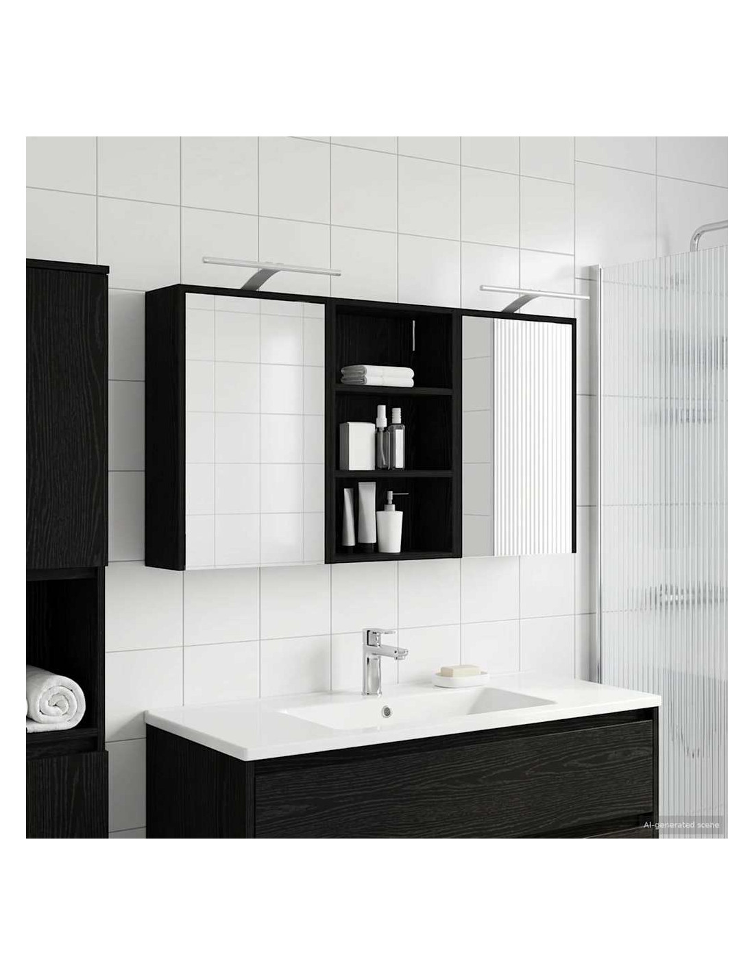 Questo Set di Armadi per Bagno è la soluzione perfetta per un bagno moderno, unendo design elegante e funzionalità. Realizzato in legno ingegnerizzato, l'armadio ha uno specchio bidirezionale che amplifica visivamente lo spazio e aggiunge un tocco di interesse. È ideale per proprietari di casa e designer, offrendo stoccaggio efficiente e migliorando l'estetica con il suo design minimalista e l'illuminazione a LED, rendendolo il perfetto mix di forma e funzione. Costruzione in Legno Ingegnerizzato: L'armadio è fatto in legno ingegnerizzato, robusto e durevole, che mantiene un aspetto impeccabile anche in condizioni di umidità. Facile da pulire e resistente all'usura. Ante a Doppia Funzione: Le porte in vetro a cerniera offrono un'apertura fluida e un design elegante. All'interno troverai scomparti spaziosi per articoli da bagno, aiutandoti a restare organizzato. Illuminazione Innovativa: Con strisce LED alimentate tramite USB, questo armadio offre un'illuminazione ideale per la cura personale, aggiungendo anche un tocco estetico alla stanza. Specchio Bidirezionale: Lo specchio unico aggiunge profondità e stile all'armadio, ideale per privacy e per riflessioni durante il trucco o la rasatura. Montaggio a Muro Facile: Questo armadio può essere facilmente montato sulle pareti, liberando spazio prezioso e garantendo un aspetto ordinato e organizzato.
