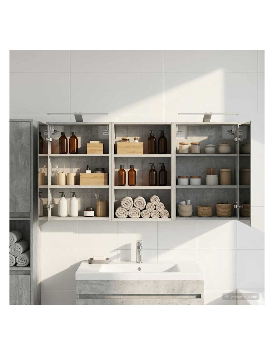 Questo Set di Armadi per Bagno è la soluzione perfetta per un bagno moderno, unendo design elegante e funzionalità. Realizzato in legno ingegnerizzato, l'armadio ha uno specchio bidirezionale che amplifica visivamente lo spazio e aggiunge un tocco di interesse. È ideale per proprietari di casa e designer, offrendo stoccaggio efficiente e migliorando l'estetica con il suo design minimalista e l'illuminazione a LED, rendendolo il perfetto mix di forma e funzione. Costruzione in Legno Ingegnerizzato: L'armadio è fatto in legno ingegnerizzato, robusto e durevole, che mantiene un aspetto impeccabile anche in condizioni di umidità. Facile da pulire e resistente all'usura. Ante a Doppia Funzione: Le porte in vetro a cerniera offrono un'apertura fluida e un design elegante. All'interno troverai scomparti spaziosi per articoli da bagno, aiutandoti a restare organizzato. Illuminazione Innovativa: Con strisce LED alimentate tramite USB, questo armadio offre un'illuminazione ideale per la cura personale, aggiungendo anche un tocco estetico alla stanza. Specchio Bidirezionale: Lo specchio unico aggiunge profondità e stile all'armadio, ideale per privacy e per riflessioni durante il trucco o la rasatura. Montaggio a Muro Facile: Questo armadio può essere facilmente montato sulle pareti, liberando spazio prezioso e garantendo un aspetto ordinato e organizzato.