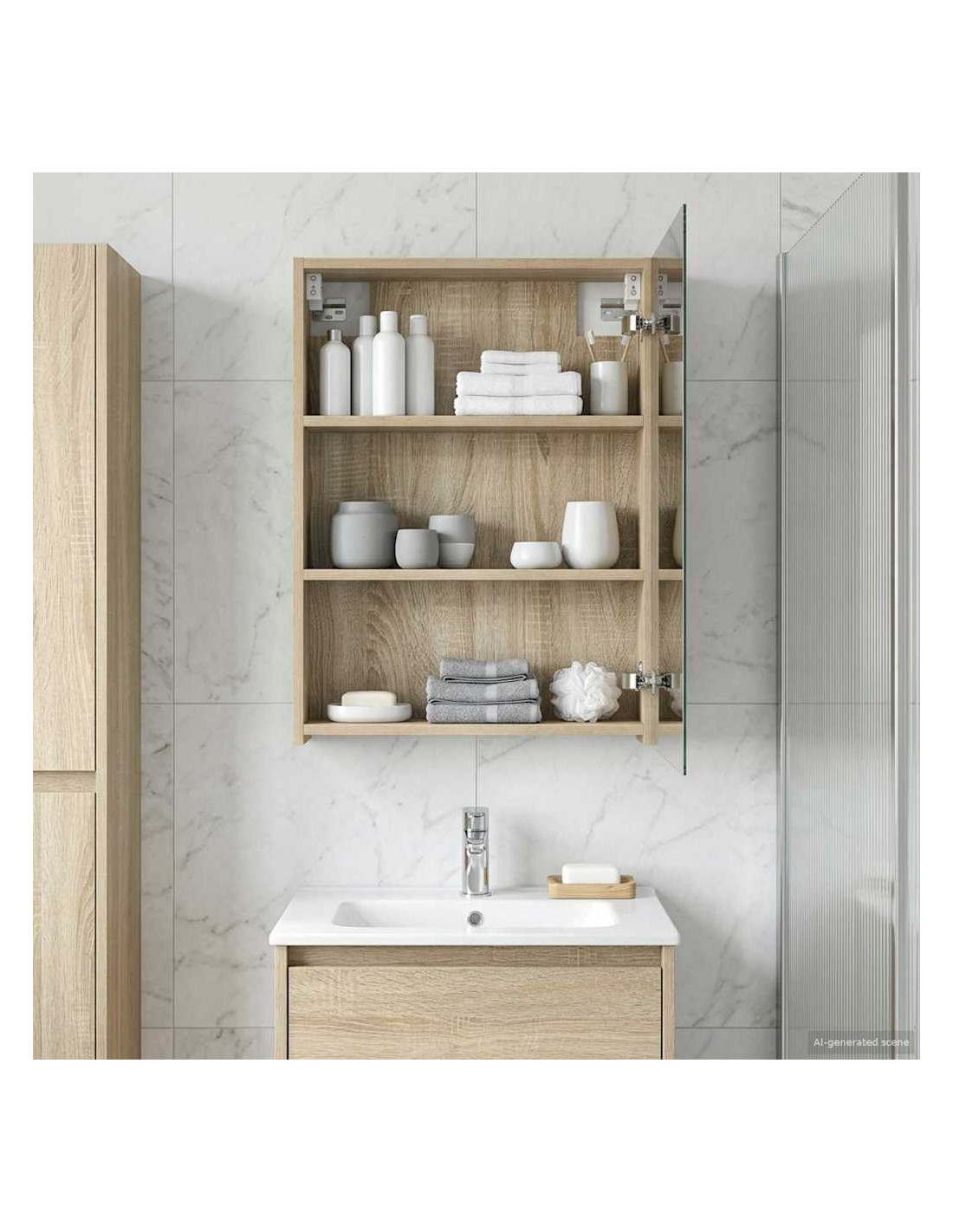 Questo armadietto a specchio moderno è la soluzione ideale per il tuo bagno. Ha un design contemporaneo, con linee pulite e minimaliste, che migliora l'arredamento. Offre abbondante spazio per riporre i tuoi essenziali e lo specchio bidirezionale è pratico e di grande impatto estetico. Costruzione in legno ingegnerizzato : Questo armadietto è realizzato in legno ingegnerizzato di alta qualità, resistente e duraturo. Grazie a questo materiale, rimarrà in ottime condizioni nel tempo. La finitura liscia conferisce un aspetto moderno, perfetto per ogni bagno. Specchio bidirezionale : Con uno specchio versatilissimo, questo armadietto ti permette di usarlo in vari modi. Da un lato è un normale specchio per le tue routine quotidiane; dall'altro, aggiunge un tocco di originalità. Questa caratteristica è utile in tante situazioni, da averne un rapido sguardo a fare chiacchiere davanti allo specchio. Design a montaggio a parete : Montando l'armadietto a parete, guadagni spazio sul pavimento, rendendolo perfetto per bagni di tutte le dimensioni. Ha un aspetto elegante e aiuta a mantenere l'ambiente ordinato, massimizzando lo spazio disponibile. È ideale per un look contemporaneo che fa colpo. Mensole in pannelli : Le mensole dell'armadietto, realizzate in legno ingegnerizzato, offrono uno spazio di stoccaggio sicuro e ben organizzato. Perfette per i tuoi prodotti da toeletta e altri essenziali, rimanendo sempre a portata di mano. Le mensole sono robuste e non cedono, mantenendo diligentemente tutto in ordine. Accesso a porta a cerniera : L'armadietto ha porte a cerniera che consentono di accedere facilmente ai tuoi oggetti. Aprono e chiudono senza fatica, assicurando una chiusura silenziosa e discreta. Questa funzionalità rende il tuo accesso facile e senza complicazioni.