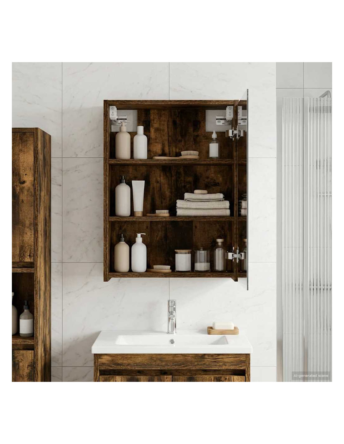 Questo mobile specchiera bagno moderno unisce stile e funzionalità con il suo design elegante, rendendolo perfetto per bagni contemporanei. È semplice e utile, si integra facilmente in qualsiasi decorazione del bagno, offrendo ottime soluzioni di stoccaggio. Con il suo specchio a doppio lato e le opzioni regolabili, si adatta alle diverse preferenze di chi lo usa. Costruzione in legno ingegnerizzato : Realizzato in legno ingegnerizzato resistente, questo mobile assicura stabilità e durata, perfetto per i bagni moderni. Non teme i cambiamenti, quindi mantiene sempre il suo fascino. Specchio bidirezionale : Questo mobile ha un innovativo specchio bidirezionale che offre sia riflessione che trasparenza, ideale per chi desidera privacy in spazi condivisi. Facilità d'uso : Con le porte a cerniera, accedi facilmente al tuo spazio. Si aprono senza problemi, così puoi prendere ciò che ti serve senza fatica. Mensole regolabili : Le mensole che puoi adattare fanno sì che tu possa tenere in ordine gli oggetti, perfette per articoli di varie dimensioni. Design montato a parete : Grazie al suo design a muro, questo mobile ti fa risparmiare spazio e offre un aspetto pulito. È particolarmente utile in bagni piccoli, per massimizzare lo spazio senza perdere in stile.