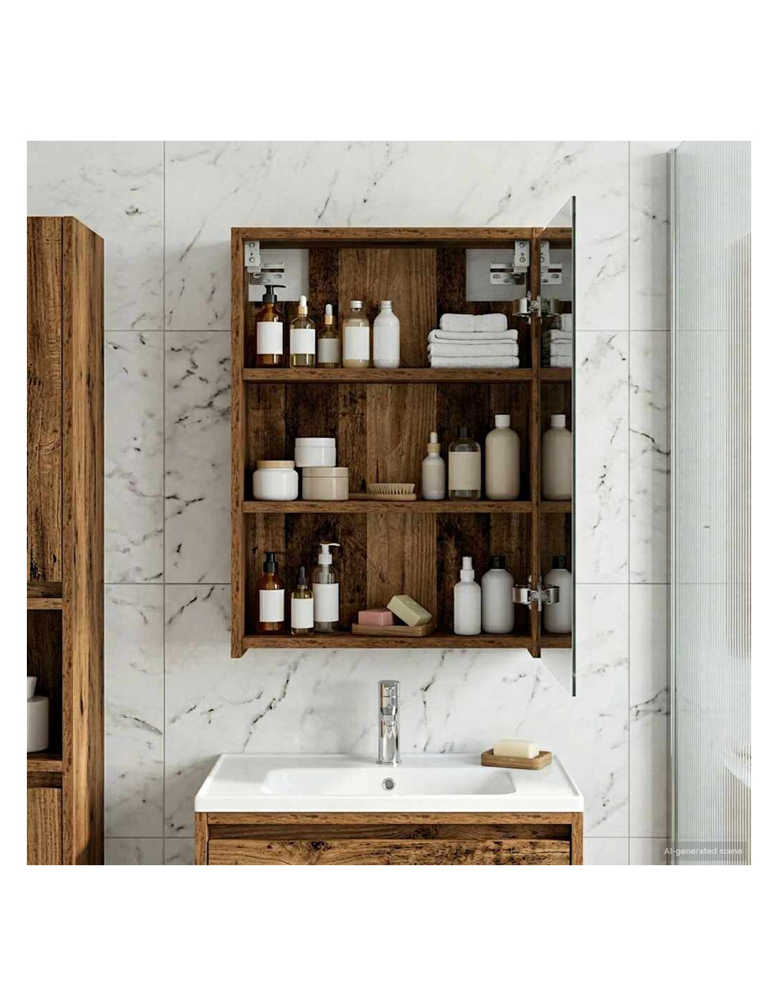 Questo mobile specchiera bagno moderno unisce stile e funzionalità con il suo design elegante, rendendolo perfetto per bagni contemporanei. È semplice e utile, si integra facilmente in qualsiasi decorazione del bagno, offrendo ottime soluzioni di stoccaggio. Con il suo specchio a doppio lato e le opzioni regolabili, si adatta alle diverse preferenze di chi lo usa. Costruzione in legno ingegnerizzato : Realizzato in legno ingegnerizzato resistente, questo mobile assicura stabilità e durata, perfetto per i bagni moderni. Non teme i cambiamenti, quindi mantiene sempre il suo fascino. Specchio bidirezionale : Questo mobile ha un innovativo specchio bidirezionale che offre sia riflessione che trasparenza, ideale per chi desidera privacy in spazi condivisi. Facilità d'uso : Con le porte a cerniera, accedi facilmente al tuo spazio. Si aprono senza problemi, così puoi prendere ciò che ti serve senza fatica. Mensole regolabili : Le mensole che puoi adattare fanno sì che tu possa tenere in ordine gli oggetti, perfette per articoli di varie dimensioni. Design montato a parete : Grazie al suo design a muro, questo mobile ti fa risparmiare spazio e offre un aspetto pulito. È particolarmente utile in bagni piccoli, per massimizzare lo spazio senza perdere in stile.
