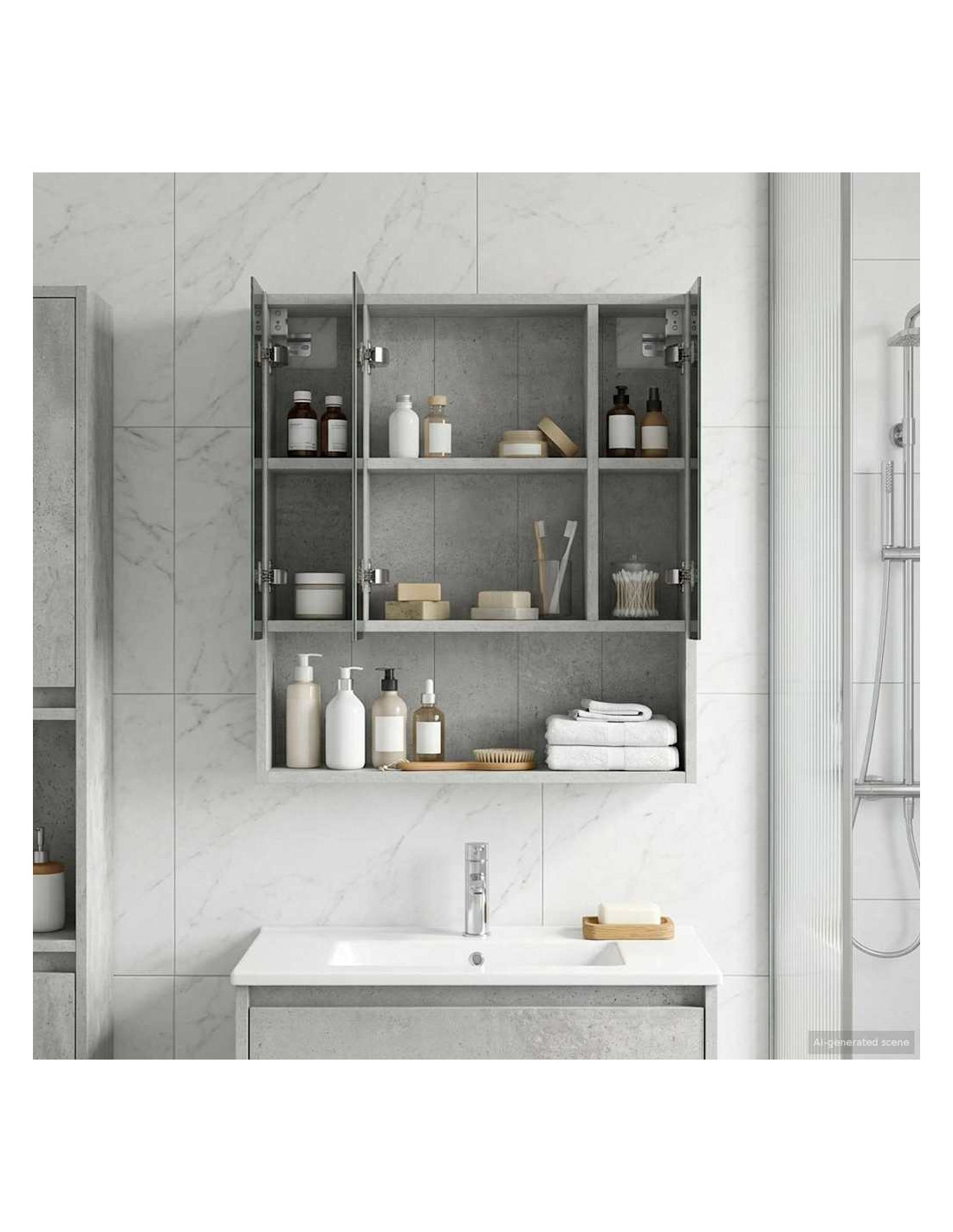 Questo cabinet specchiante è un accessorio raffinato che migliora il tuo bagno. Con il suo design elegante e rettangolare, è perfetto per chi cerca di dare un tocco di stile e funzionalità. Lo specchio a due vie offre privacy ed eleganza, ideale per la routine mattutina in un bagno moderno. Materiale: Realizzato in legno ingegnerizzato, resistente e waterproof, perfetto per resistere all'umidità del bagno. La robustezza garantisce durata nel tempo, mentre la finitura liscia aggiunge un tocco chic a qualsiasi arredamento. Componenti Inclusi: Include due ripiani di alta qualità, offrendo ampio spazio per organizzare prodotti e accessori. Gli specchi amplificano luce e spazio, mentre i ripiani regolabili si adattano a diverse altezze di oggetti. Funzionalità Moderna: Con un specchio a doppia faccia per maggiore versatilità, questo cabinet è pratico e chic. Il design a parete mantiene tutto in ordine, ideale per bagni moderni che esaltano eleganza ed efficienza. Usi Consigliati: Perfetto per il bagno col suo look elegante, ma ottimo anche per spogliatoi o aree trucco. Si adatta a routine diverse, migliorando accessibilità e funzionalità. Care & Maintenance: Basta pulirlo con un panno morbido per tenerlo in ottime condizioni. Evita prodotti abrasivi per non rovinare la finitura. Una pulizia regolare mantiene il riflesso chiaro, facendo sembrare il cabinet come nuovo.