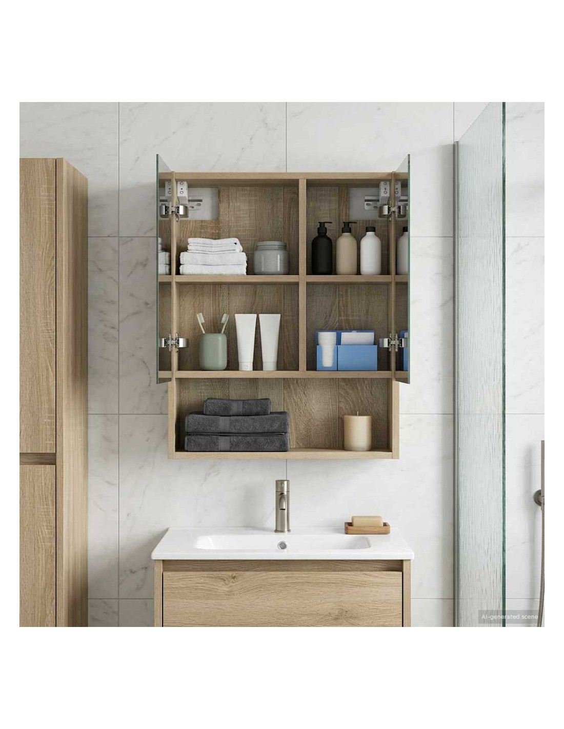 Questo cabinet specchiante è un accessorio raffinato che migliora il tuo bagno. Con il suo design elegante e rettangolare, è perfetto per chi cerca di dare un tocco di stile e funzionalità. Lo specchio a due vie offre privacy ed eleganza, ideale per la routine mattutina in un bagno moderno. Materiale: Realizzato in legno ingegnerizzato, resistente e waterproof, perfetto per resistere all'umidità del bagno. La robustezza garantisce durata nel tempo, mentre la finitura liscia aggiunge un tocco chic a qualsiasi arredamento. Componenti Inclusi: Include due ripiani di alta qualità, offrendo ampio spazio per organizzare prodotti e accessori. Gli specchi amplificano luce e spazio, mentre i ripiani regolabili si adattano a diverse altezze di oggetti. Funzionalità Moderna: Con un specchio a doppia faccia per maggiore versatilità, questo cabinet è pratico e chic. Il design a parete mantiene tutto in ordine, ideale per bagni moderni che esaltano eleganza ed efficienza. Usi Consigliati: Perfetto per il bagno col suo look elegante, ma ottimo anche per spogliatoi o aree trucco. Si adatta a routine diverse, migliorando accessibilità e funzionalità. Care & Maintenance: Basta pulirlo con un panno morbido per tenerlo in ottime condizioni. Evita prodotti abrasivi per non rovinare la finitura. Una pulizia regolare mantiene il riflesso chiaro, facendo sembrare il cabinet come nuovo.
