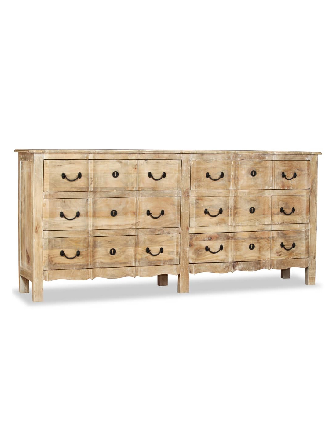 Il legno di mango è stato trattato con uno stile distintivo per renderlo più resistente all'usura pur conservando il suo fascino naturale. Le doppie maniglie su ogni cassetto facilitano l'apertura dei cassetti e aggiungono anche un aspetto vintage al mobile. Le linee curve nella parte inferiore emanano un tocco di eleganza ed evidenziano la raffinata lavorazione artigianale.