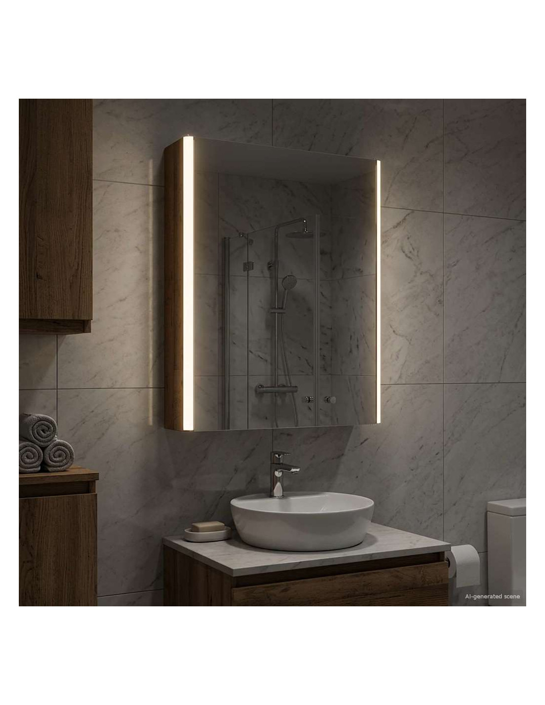 Questo armadietto a specchio per il bagno è una combinazione di design moderno e funzionalità pratica, essenziale per ogni bagno contemporaneo. La forma minimale e le linee chiare danno un tocco elegante, pur offrendo spazio per riporre gli oggetti di uso quotidiano. Include luci discrete che migliorano sia la visibilità che l'atmosfera, unendo utilità e stile in modo efficace. Costruzione in legno ingegnerizzato Questo armadietto è realizzato in legno ingegnerizzato resistente, che assicura durata e un aspetto raffinato. Questo materiale resiste bene all'umidità e alla deformazione, ideale per i bagni. Scaffalature versatili Gli scaffali in legno ingegnerizzato offrono soluzioni funzionali per vari articoli da toeletta. Grazie ai suoi ripiani regolabili, si adatta facilmente a oggetti di diverse dimensioni. Specchio doppio Con il suo specchio bidirezionale, combina riflesso e trasparenza. È ideale sia per le routine di bellezza sia per una maggiore privacy. Illuminazione LED regolabile Montato con luci LED a basso consumo, l'armadietto offre un'illuminazione personalizzata per ogni attività. Illumina bene gli spazi e si adatta facilmente all'arredamento. Installazione a parete sicura Progettato per un'installazione a parete, ottimizza lo spazio senza sacrificare la capacità di stoccaggio. Il sistema di montaggio è sicuro e insieme alle porte a cerniera assicura un facile accesso.