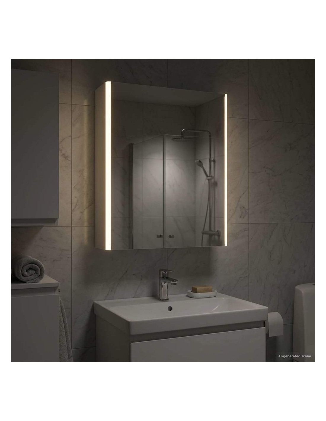 Questo armadietto a specchio per il bagno è una combinazione di design moderno e funzionalità pratica, essenziale per ogni bagno contemporaneo. La forma minimale e le linee chiare danno un tocco elegante, pur offrendo spazio per riporre gli oggetti di uso quotidiano. Include luci discrete che migliorano sia la visibilità che l'atmosfera, unendo utilità e stile in modo efficace. Costruzione in legno ingegnerizzato Questo armadietto è realizzato in legno ingegnerizzato resistente, che assicura durata e un aspetto raffinato. Questo materiale resiste bene all'umidità e alla deformazione, ideale per i bagni. Scaffalature versatili Gli scaffali in legno ingegnerizzato offrono soluzioni funzionali per vari articoli da toeletta. Grazie ai suoi ripiani regolabili, si adatta facilmente a oggetti di diverse dimensioni. Specchio doppio Con il suo specchio bidirezionale, combina riflesso e trasparenza. È ideale sia per le routine di bellezza sia per una maggiore privacy. Illuminazione LED regolabile Montato con luci LED a basso consumo, l'armadietto offre un'illuminazione personalizzata per ogni attività. Illumina bene gli spazi e si adatta facilmente all'arredamento. Installazione a parete sicura Progettato per un'installazione a parete, ottimizza lo spazio senza sacrificare la capacità di stoccaggio. Il sistema di montaggio è sicuro e insieme alle porte a cerniera assicura un facile accesso.